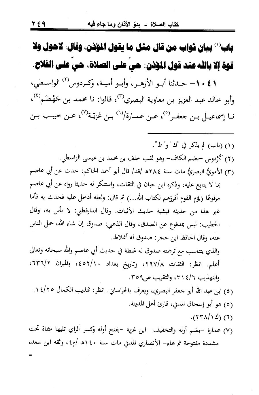 -[250]- عبد الرحمن (¬7)، عن حفص بن عاصم بن عمر بن الخطاب، عن أبيه، عن جده عمر بن الخطاب رضي الله عنه قال: قال رسول الله صلى الله عليه وسلم: "إذا قال المؤذن: الله أكبر الله أكبر، فقال أحدكم: الله أكبر الله أكبر، ثم قال: أشهد أن لا إله إلا الله، فقال: أشهد أن لا إله إلا الله، قال: أشهد أن محمدًا رسول الله، قال: أشهد أن محمدًا رسول الله، ثم (¬8) قال: حيّ على الصلاة، قال: لا حول ولا قوة إلا الله، ثم قال: حيّ على الفلاح، قال: لا حول ولا قوة إلا بالله، ثم قال: الله أكبر الله أكبر، قال: الله أكبر الله أكبر، ثم قال: لا إله إلا الله، قال: لا إله إلا الله من قلبه دخل الجنة" (¬9).