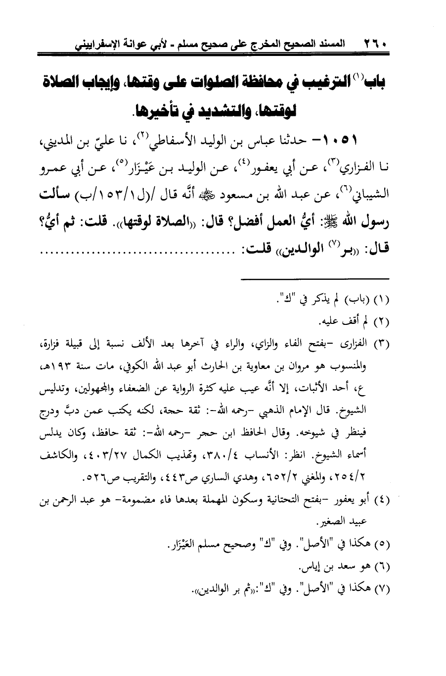 1051 - حدثنا عباس بن الوليد الأسفاطي (¬1)، نا عليّ بن المديني، نا الفزاري (¬2)، عن أبي يعفور (¬3)، عن الوليد بن عَيْزَار (¬4)، عن أبي عمرو الشيباني (¬5)، عن عبد الله بن مسعود رضي الله عنه أنَّه سألت رسول الله صلى الله عليه وسلم: أيُّ العمل أفضل؟ قال: "الصلاة لوقتها". قلت: ثم أيُّ؟ قال: "بر (¬6) الوالدين" قلت: