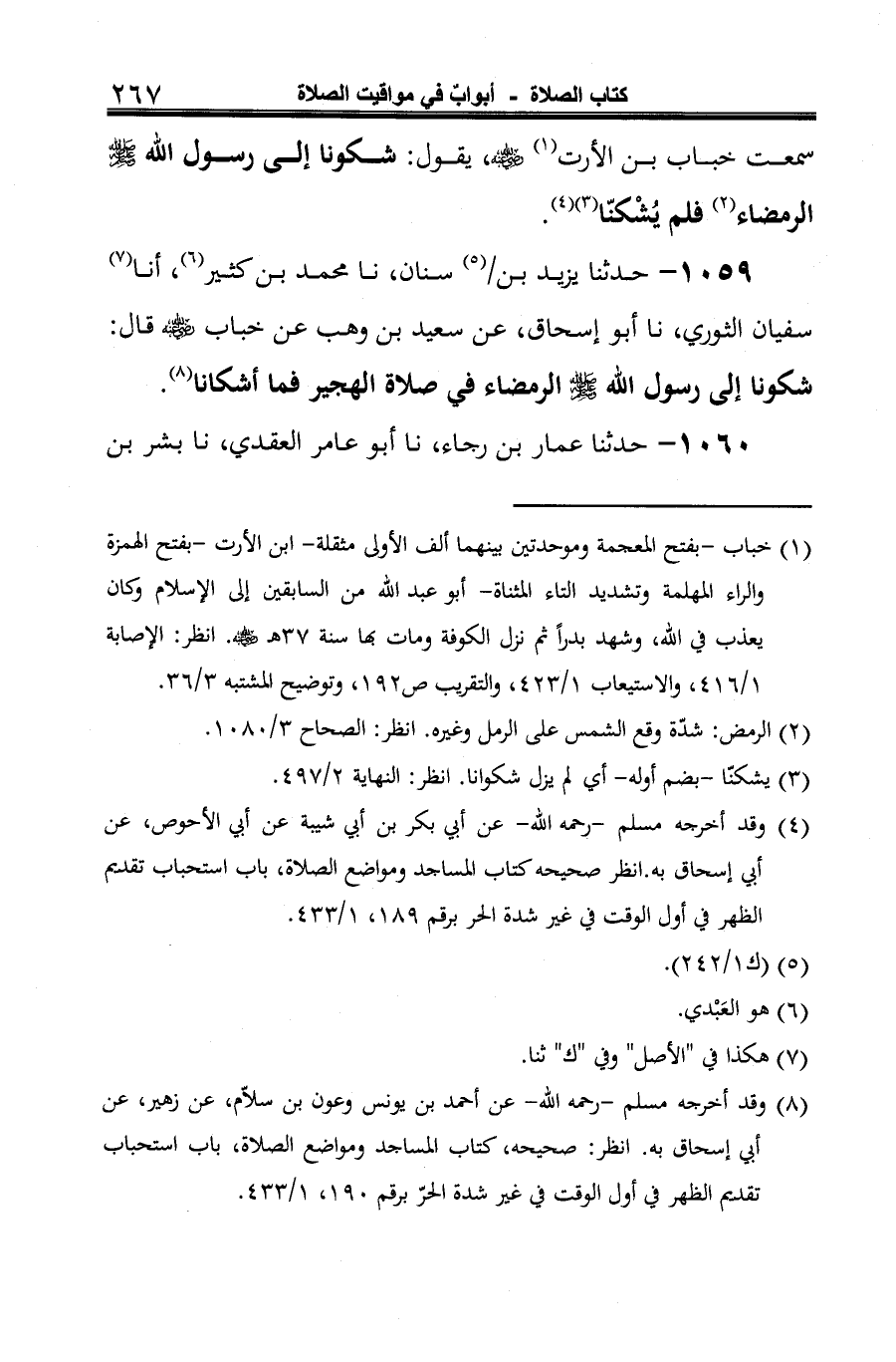 1059 - حدثنا يزيد بن (¬1) سنان، نا محمد بن كثير (¬2)، أنا (¬3) سفيان الثوري، نا أبو إسحاق، عن سعيد بن وهب عن خباب -رضي الله عنه- قال: شكونا إلى رسول الله -صلى الله عليه وسلم- الرمضاء في صلاة الهجير فما أشكانا (¬4).