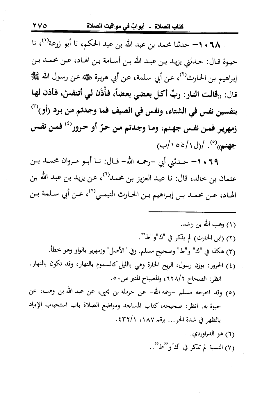 1068 - حدثنا محمد بن عبد الله بن عبد الحكم، نا أبو زرعة (¬1)، نا حيوة قال: حدثني يزيد بن عبد الله بن أسامة بن الهاد، عن محمد بن إبراهيم بن الحارث (¬2)، عن أبي سلمة، عن أبي هريرة رضي الله عنه عن رسول الله صلى الله عليه وسلم قال: "قالت النار: ربِّ أكل بعضي بعضًا، فأْذَن لي أتنفسْ، فأذن لها بنفسين نفس في الشتاء، ونفس في الصيف فما وجدتم من برد (أو) (¬3) زمهرير فمن نفس جهنم، وما وجدتم من حرّ أو حرور (¬4) فمن نفس جهنم" (¬5).
