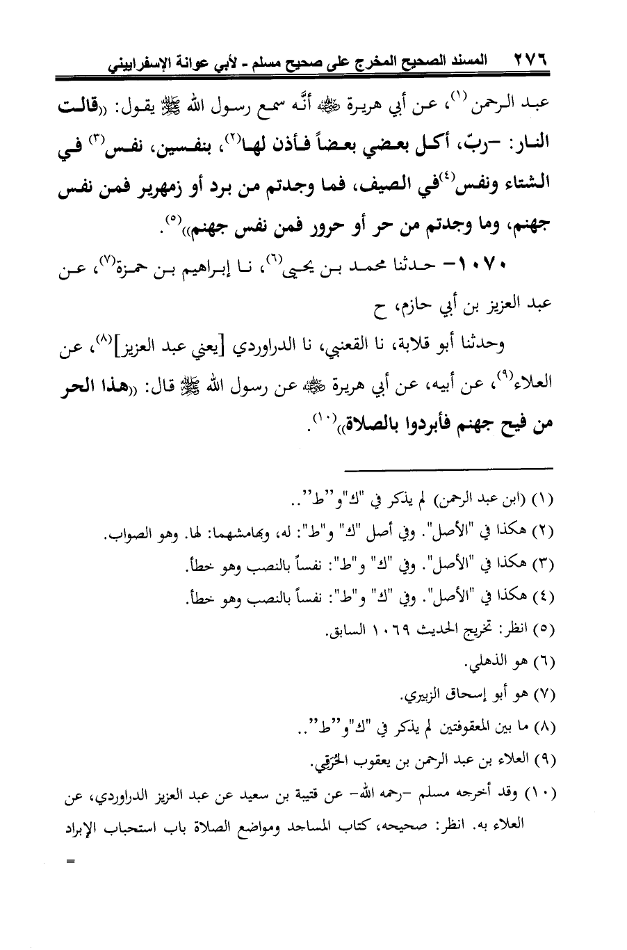 وحدثنا أبو قلابة، نا القعنبي، نا الدراوردي [يعني عبد العزيز] (¬3)، عن العلاء (¬4)، عن أبيه، عن أبي هريرة رضي الله عنه عن رسول الله صلى الله عليه وسلم قال: "هذا الحر من فيح جهنم فأبردوا بالصلاة" (¬5).