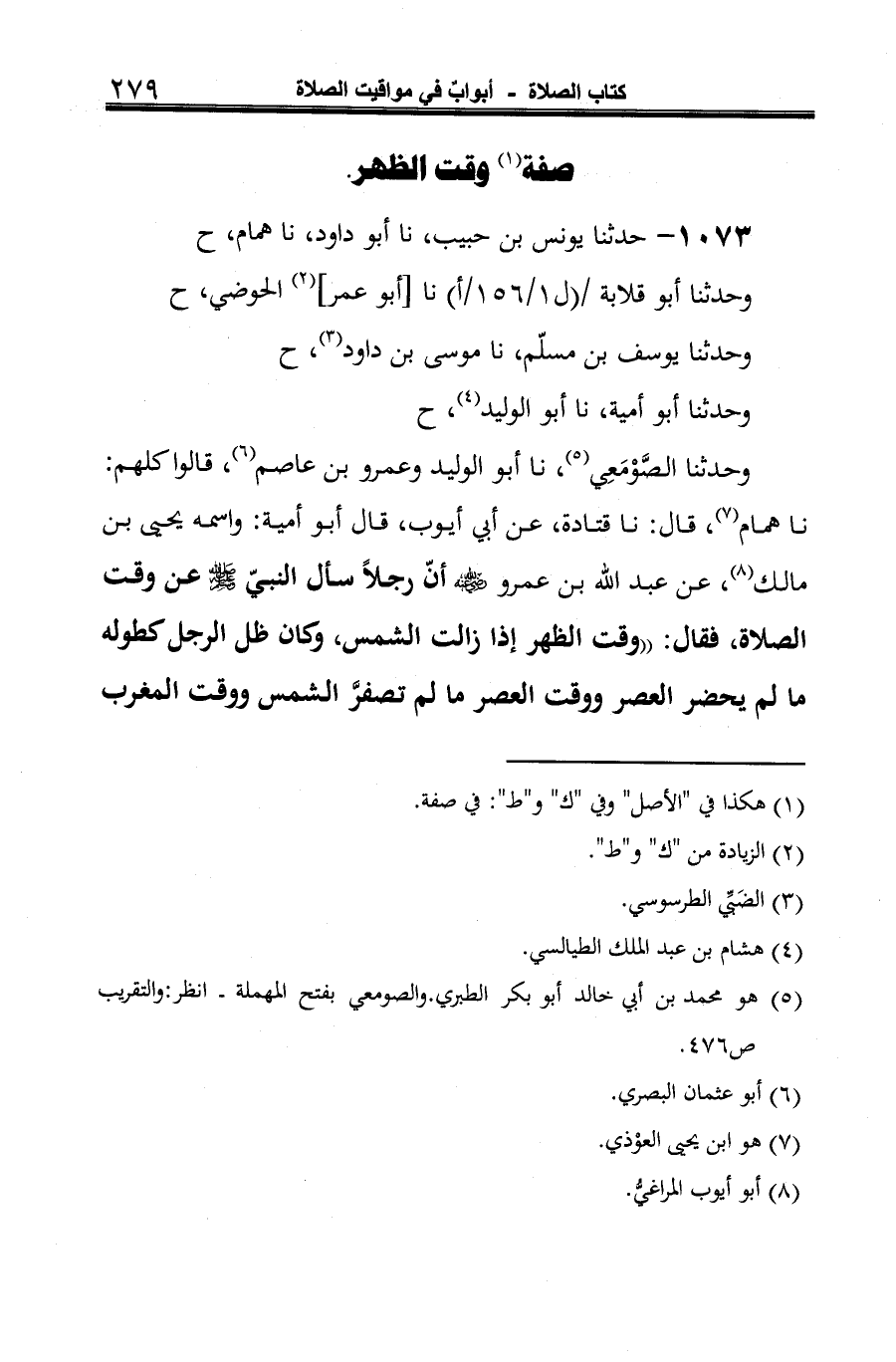 وحدثنا الصَّوْمَعِي (¬4)، نا أبو الوليد وعمرو بن عاصم (¬5)، قالوا كلهم: نا همام (¬6)، قال: نا قتادة، عن أبي أيوب، قال أبو أمية: واسمه يحيى بن مالك (¬7)، عن عبد الله بن عمر -رضي الله عنه- أنّ رجلًا سأل النبي -صلى الله عليه وسلم- عن وقت الصلاة، فقال: "وقت الظهر إذا زالت الشمس، وكان ظل الرجل كطوله ما لم يحضر العصر ووقت العصر ما لم تصفرَّ الشمس ووقت المغرب