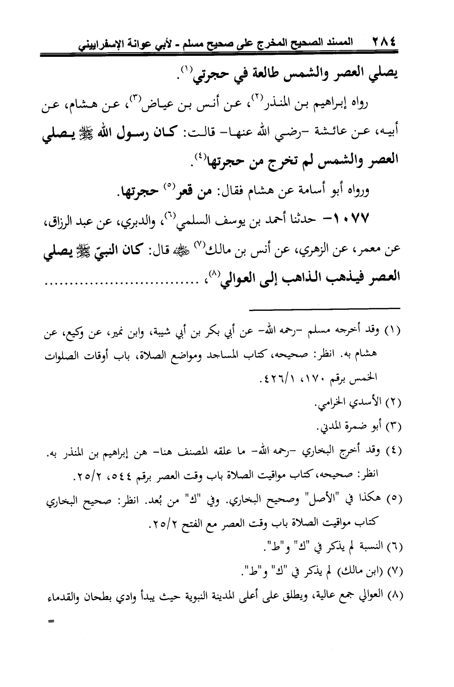 1077 - حدثنا أحمد بن يوسف السلمي (¬1)، والدبري، عن عبد الرزاق، عن معمر، عن الزهري، عن أنس بن مالك (¬2) رضي الله عنه قال: كان النبيّ -صلى الله عليه وسلم- يصلي العصر فيذهب الذاهب إلى العوالي (¬3)،