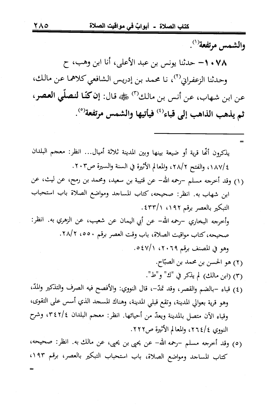 وحدثنا الزعفراني (¬1)، نا محمد بن إدريس الشافعي كلاهما عن مالك، عن ابن شهاب، عن أنس بن مالك (¬2) رضي الله عنه قال: إن كنّا لنصلّي العصر، ثم يذهب الذاهب إلى قباء (¬3) فيأتيها والشمس مرتفعة (¬4).