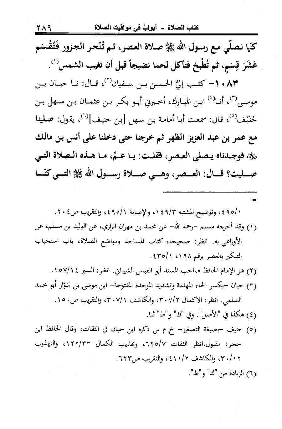 1083 - كتب إليَّ الحسن بن سفيان (¬1)، قال: نا حبان بن موسى (¬2)، أنا (¬3) ابن المبارك، أخبرني أبو بكر بن عثمان بن سهل بن حُنَيْف (¬4)، قال: سمعت أبا أمامة بن سهل [بن حنيف] (¬5)، يقول: صلينا مع عمر بن عبد العزيز الظهر ثم خرجنا حتى دخلنا على أنس بن مالك -رضي الله عنه- فوجدناه يصلي العصر، فقلت: يا عمِّ، ما هذه الصلاة التي صليت؟ قال: العصر، وهي صلاة رسول الله صلى الله عليه وسلم التي كنّا