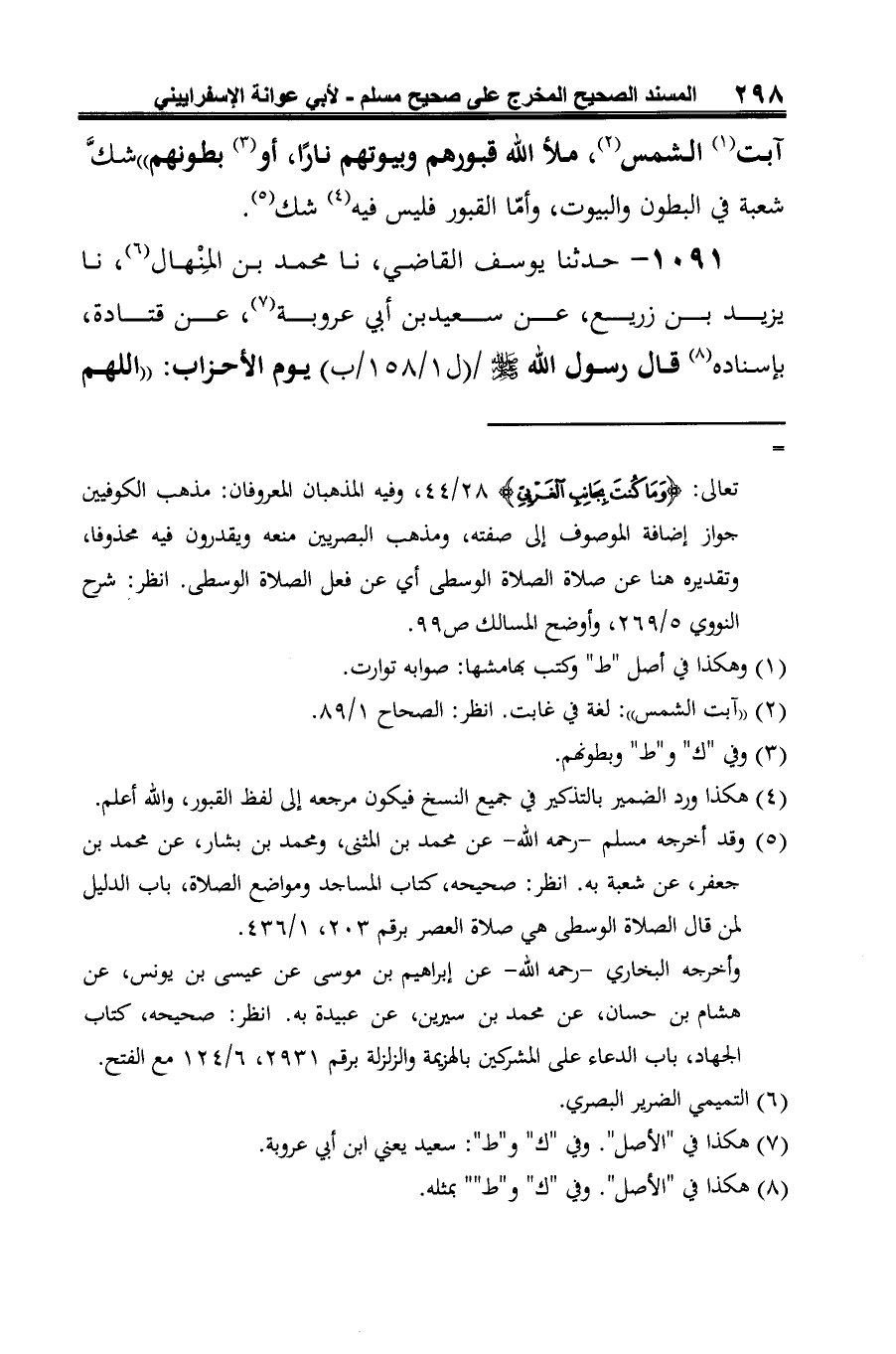 -[299]- املأ عليهم قبورهم وبيوتهم نارًا كما حبسونا عن الصلاة (¬4) الوسطى حتى آبت الشمس (¬5) " (¬6).