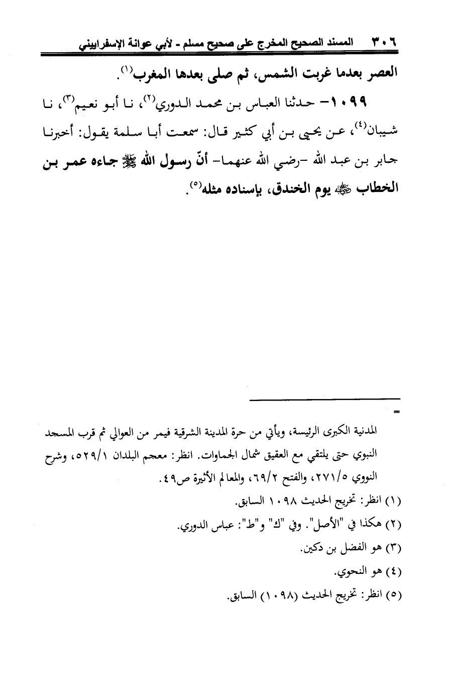 1099 - حدثنا العباس بن محمد الدوري (¬1)، نا أبو نعيم (¬2)، نا شيبان (¬3)، عن يحيى بن أبي كثير قال: سمعت أبا سلمة يقول: أخبرنا جابر بن عبد الله -رضي الله عنهما- أنّ رسول الله صلى الله عليه وسلم جاءه عمر بن الخطاب -رضي الله عنه- يوم الخندق، بإسناده مثله (¬4).