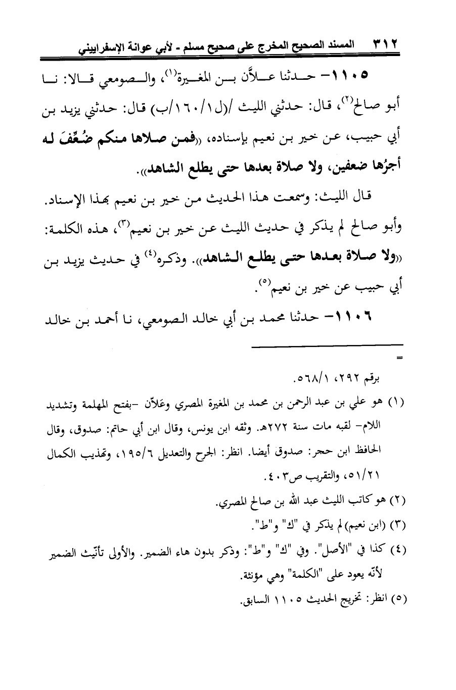 1105 - حدثنا علَّان بن المغيرة (¬1)، والصومعي قالا: نا أبو صالح (¬2)، قال: حدثني الليث قال: حدثني يزيد بن أبي حبيب، عن خير بن نعيم بإسناده، "فمن صلاها منكم ضُعِّفَ له أجرُها ضعفين، ولا صلاة بعدها حتى يطلع الشاهد".