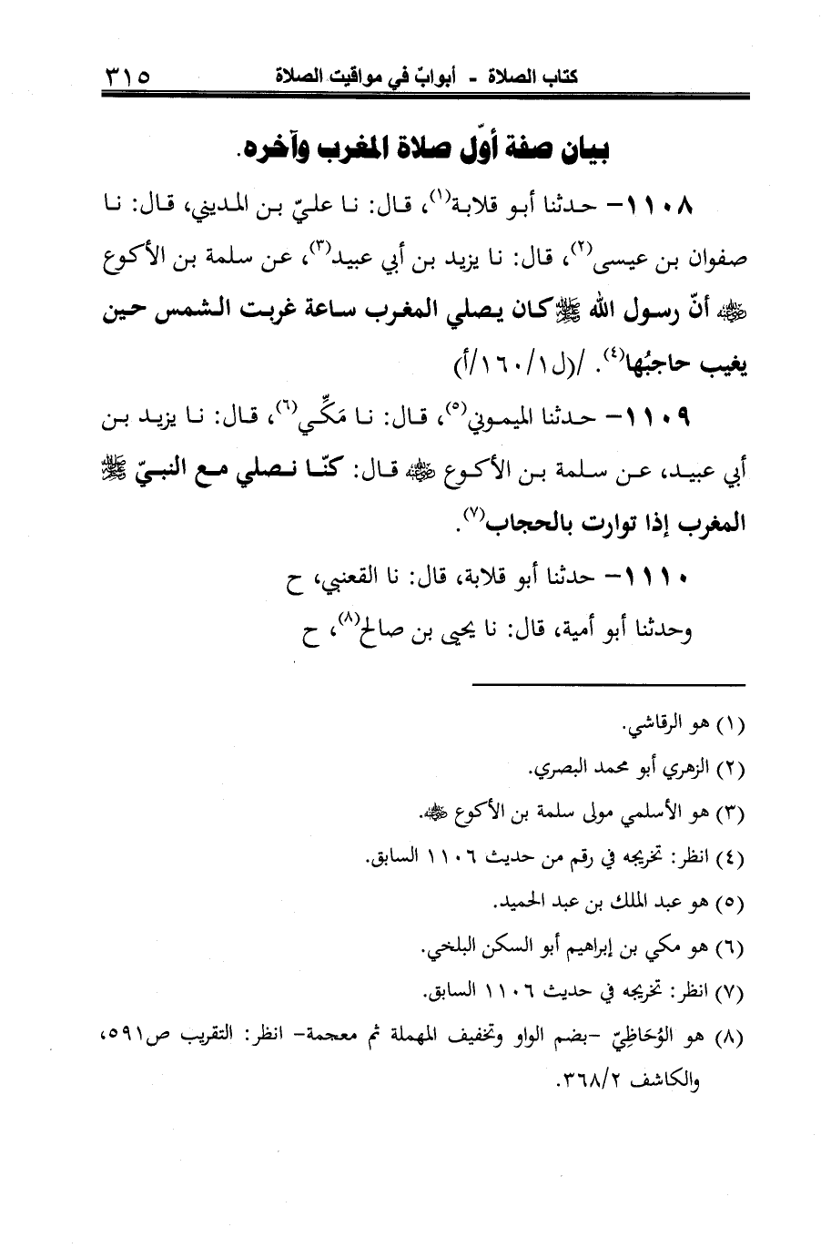 1109 - حدثنا الميموني (¬1)، قال: نا مَكِّي (¬2)، قال: نا يزيد بن أبي عبيد، عن سلمة بن الأكوع رضي الله عنه قال: كنّا نصلي مع النبيّ صلى الله عليه وسلم المغرب إذا توارت بالحجاب (¬3).