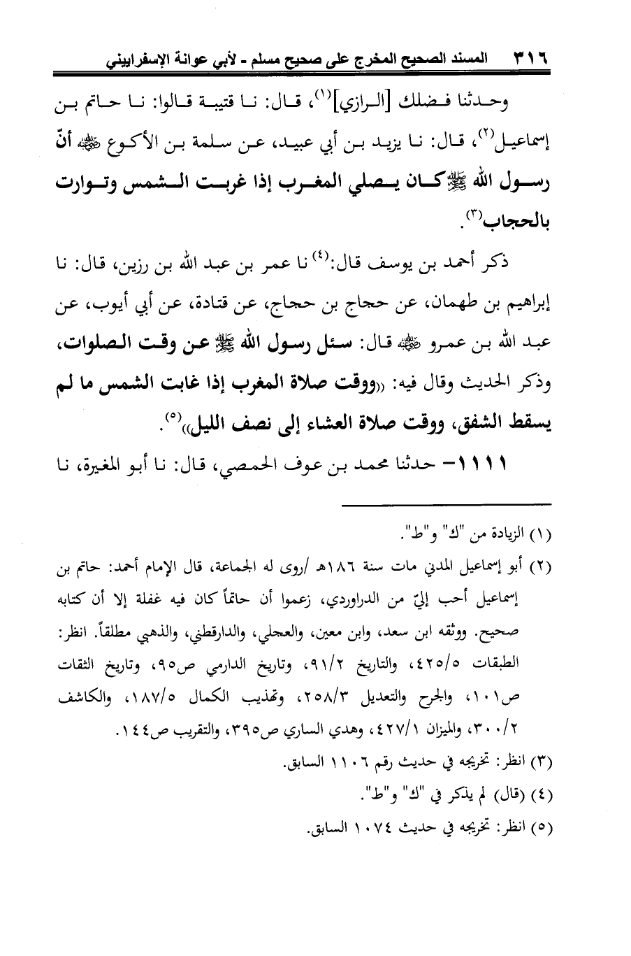 (¬5) وقد أخرجه مسلم -رحمه الله- عن أبي غسان المسمعي به. انظر: صحيحه، كتاب المساجد ومواضع الصلاة باب أوقات الصلوات الخمس برقم 171، 1/ 426.