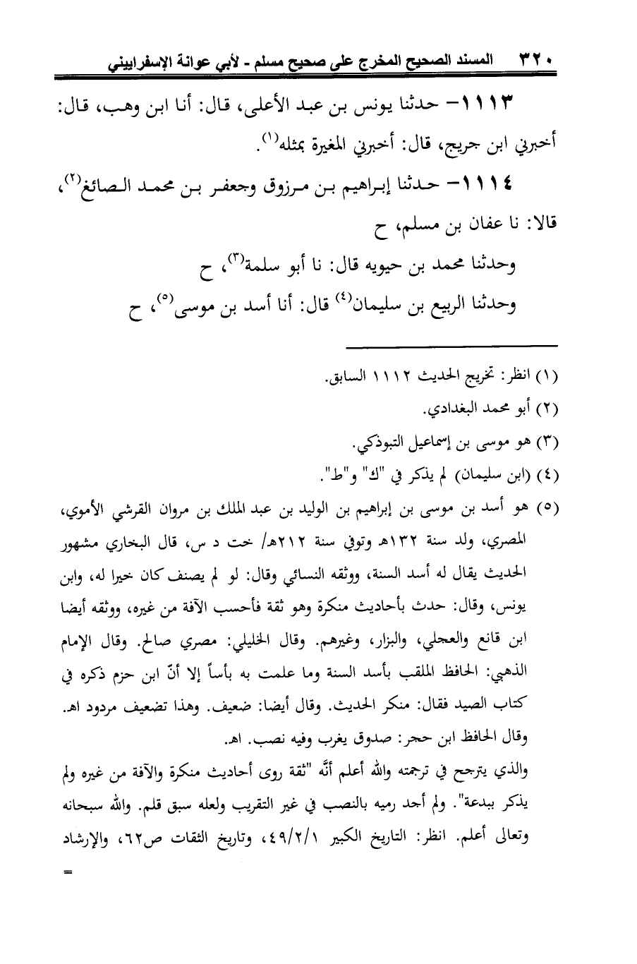 (¬4) هو أسد بن موسى بن إبراهيم بن الوليد بن عبد الملك بن مروان القرشي الأموي، المصري، ولد سنة 132 هـ وتوفي سنة 212 هـ / خت د س، قال البخاري مشهور الحديث يقال له أسد السنة، ووثقه النسائي وقال: لو لم يصنف كان خيرا له، وابن يونس، وقال: حدث بأحاديث منكرة وهو ثقة فأحسب الآفة من غيره، ووثقه أيضا ابن قانع والعجلي، والبزار، وغيرهم. وقال الخليلي: مصري صالح. وقال الإمام الذهبي: الحافظ الملقب بأسد السنة وما علمت به بأسًا إلا أنّ ابن حزم ذكره في كتاب الصيد فقال: منكر الحديث. وقال أيضا: ضعيف. وهذا تضعيف مردود اهـ.