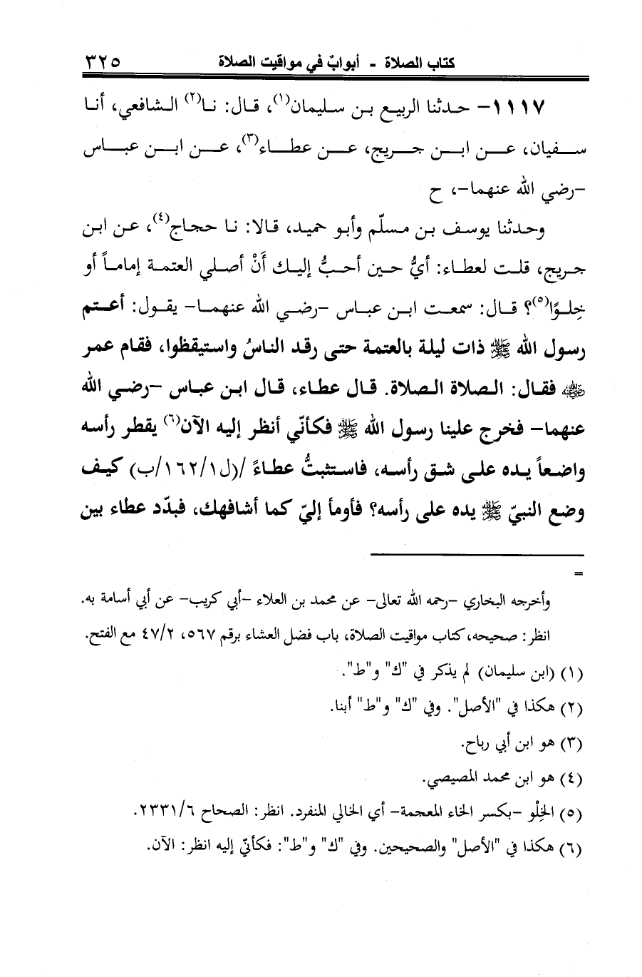 -[327]- = جريج به. انظر: صحيحه، كتاب المساجد ومواضع الصلاة، باب وقت العشاء وتأخيرها برقم 225، 1/ 444.