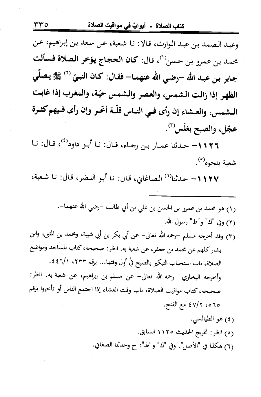-[336]- عن سعد بن إبراهيم، قال: سمعت محمد بن عمرو بن الحسن، قال: سألنا جابر بن عبد الله -رضي الله عنهما- في زمن الحجاج، وكان يؤخّر الصلاة عن وقت الصلاة، فقال جابر -رضي الله عنه- كان النبيّ صلى الله عليه وسلم يصلي الظهر حين تزول الشمس، والعصر وهي حيّة، أو نقيّة، والمغرب حين تجب الشمس، والعشاء ربما عجّل وربما أخر؛ إذا اجتمع الناس عجّل، وإذا تأخروا أخر، والصبح كانوا -أو كنّا- نصليها بغلس (¬2).