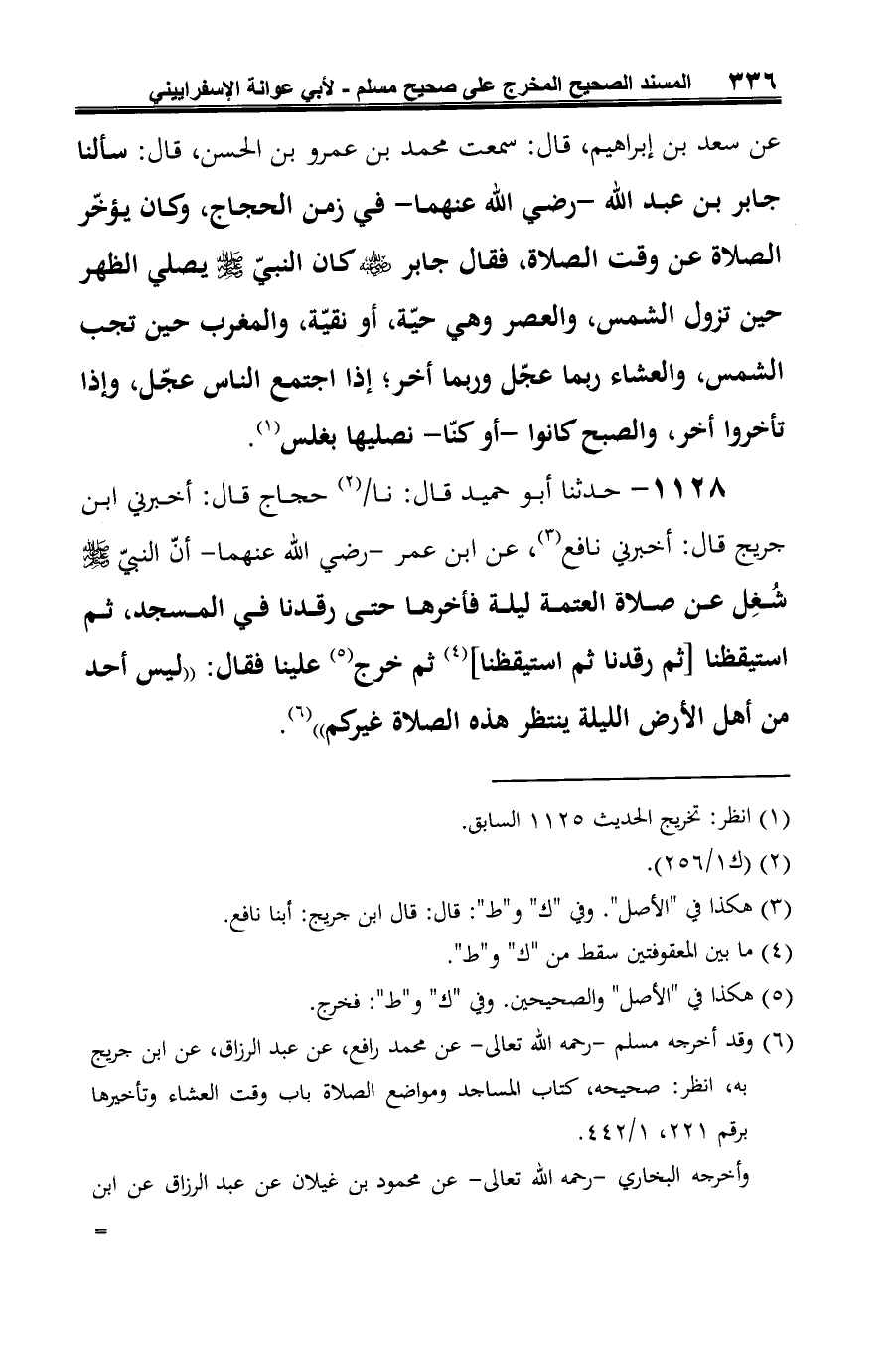 (¬5) وقد أخرجه مسلم -رحمه الله تعالى- عن محمد رافع، عن عبد الرزاق، عن ابن جريج به، انظر: صحيحه، كتاب المساجد ومواضع الصلاة باب وقت العشاء وتأخيرها برقم، 221، 1/ 442.