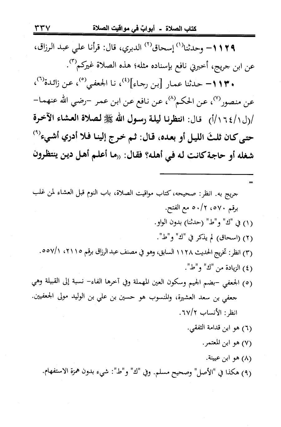 1130 - حدثنا عمار [بن رجاء] (¬1)، نا الجعفي (¬2)، عن زائدة (¬3)، عن منصور (¬4)، عن الحكم (¬5)، عن نافع عن ابن عمر -رضي الله عنهما- قال: انتظرنا ليلة رسول الله صلى الله عليه وسلم لصلاة العشاء الآخرة حتى كان ثلثَ الليل أو بعده، قال: ثم خرج إلينا فلا أدري أشيء (¬6) شغله أو حاجة كانت له في أهله؟ فقال: "ما أعلم أهل دين ينتظرون