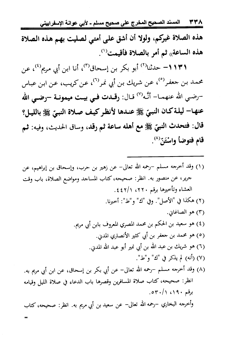 1131 - حدثنا (¬1) أبو بكر بن إسحاق (¬2)، أنا ابن أبي مريم (¬3)، عن محمد بن جعفر (¬4)، عن شريك بن أبي نمر (¬5)، عن كريب، عن ابن عباس -رضي الله عنهما- أنَّه (¬6) قال: رقدت في بيت ميمونة -رضي الله عنها- ليلة كان النبيّ صلى الله عليه وسلم عندها لأنظر كيف صلاة النبيّ صلى الله عليه وسلم بالليل؟ قال: فتحدث النبيّ صلى الله عليه وسلم مع أهله ساعة ثم رقد، وساق الحديث، وفيه: ثم قام فتوضأ واسْتَنَّ (¬7).