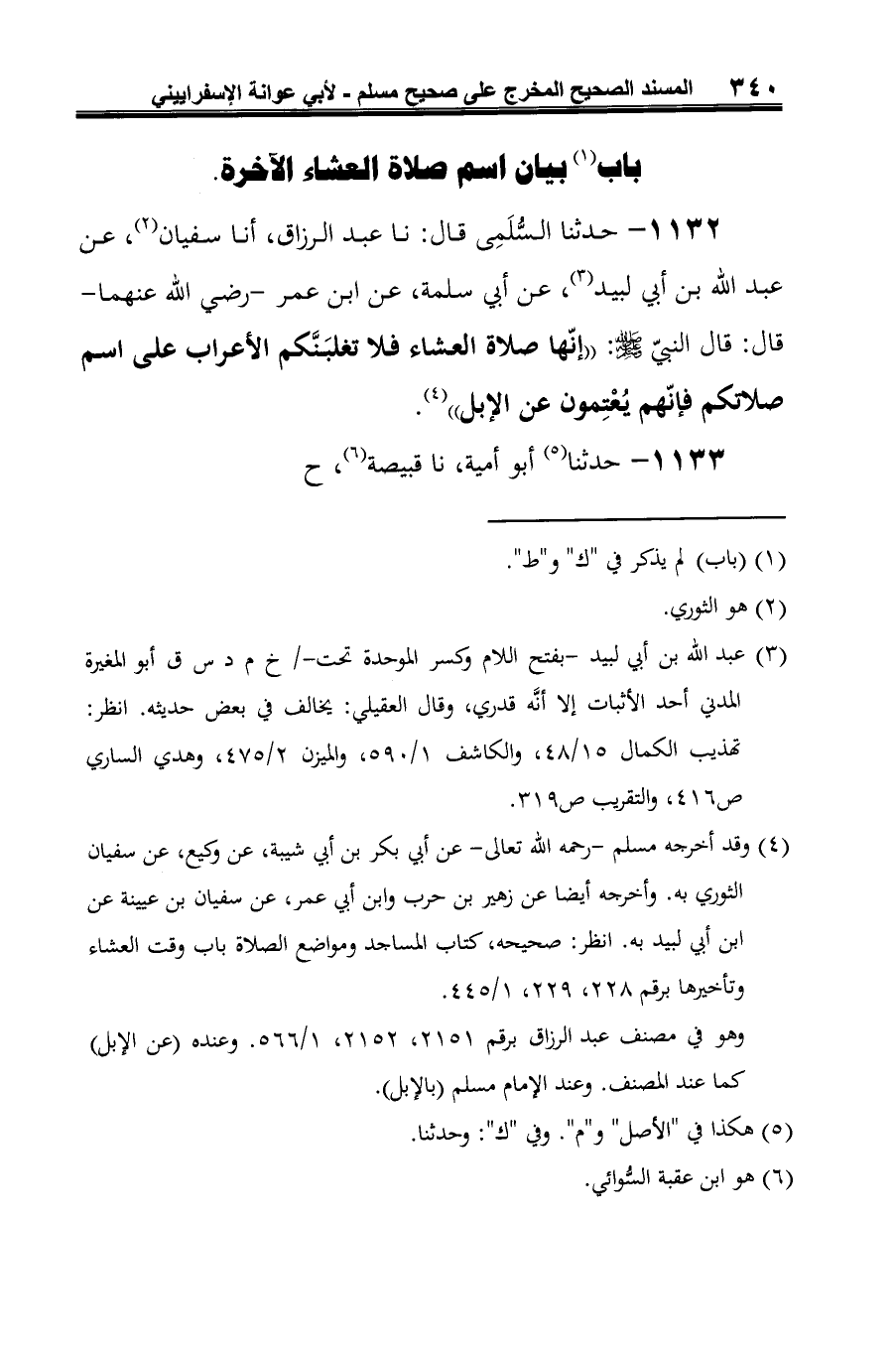 1132 - حدثنا السُّلَمِي قال: نا عبد الرزاق، أنا سفيان (¬1)، عن عبد الله بن أبي لبيد (¬2)، عن أبي سلمة، عن ابن عمر -رضي الله عنهما- قال: قال النبي صلى الله عليه وسلم: "إنّها صلاة العشاء فلا تغلبَنَّكم الأعراب على اسم صلاتكم فإنّهم يُعْتِمون عن الإبل" (¬3).