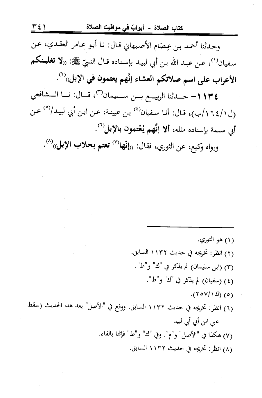 1134 - حدثنا الربيع بن سليمان (¬1)، قال: نا الشافعي، قال: أنا سفيان (¬2) بن عيينة، عن ابن أبي لبيد (¬3) عن أبي سلمة بإسناده مثله، ألا إنَّهم يُعْتمون بالإبل (¬4).