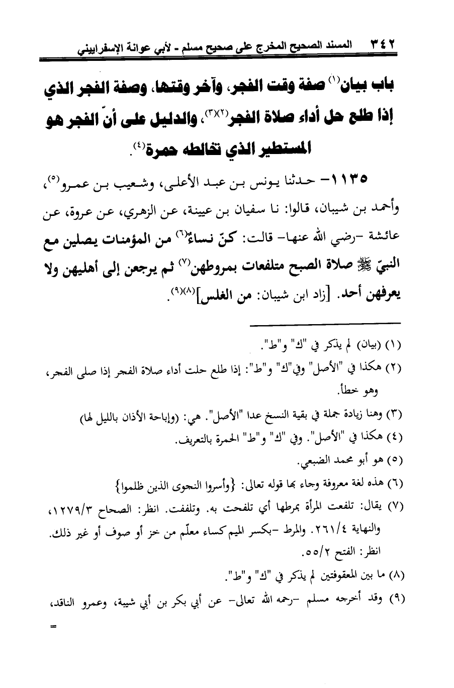 1135 - حدثنا يونس بن عبد الأعلى، وشعيب بن عمرو (¬1)، وأحمد بن شيبان، قالوا: نا سفيان بن عيينة، عن الزهري، عن عروة، عن عائشة -رضي الله عنها- قالت: كنّ نساءٌ (¬2) من المؤمنات يصلين مع النبيّ صلى الله عليه وسلم صلاة الصبح متلفعات بمروطهن (¬3) ثم يرجعن إلى أهليهن ولا يعرفهن أحد. [زاد ابن شيبان: من الغلس] (¬4) (¬5).