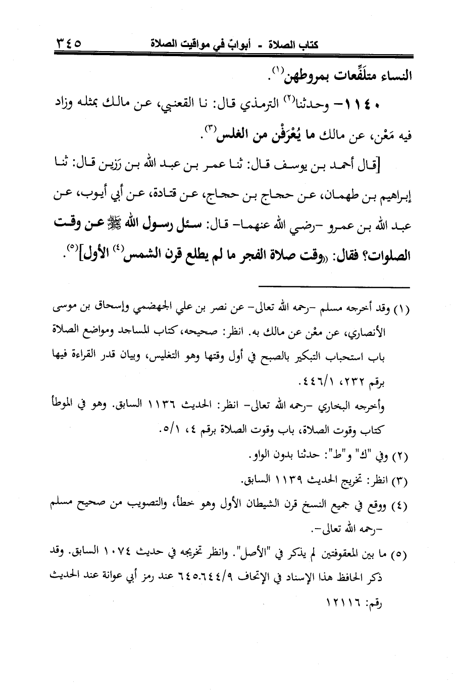 1140 - وحدثنا (¬1) الترمذي قال: نا القعنبي، عن مالك بمثله وزاد فيه مَعْن، عن مالك ما يُعْرَفْن من الغلس (¬2).