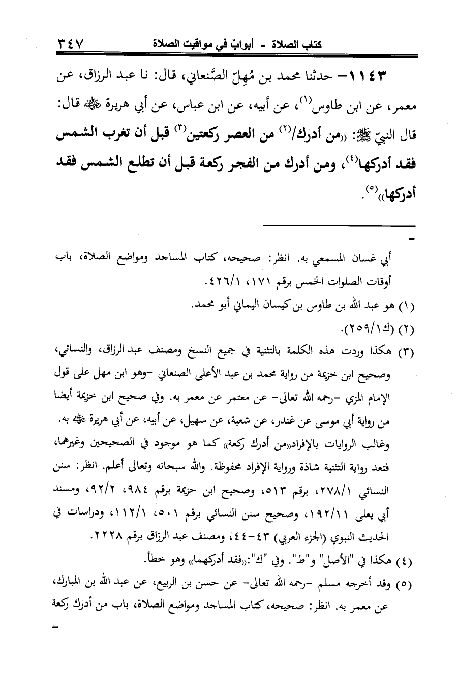 1143 - حدثنا محمد بن مُهِلّ الصَّنعاني، قال: نا عبد الرزاق، عن معمر، عن ابن طاوس (¬1)، عن أبيه، عن ابن عباس، عن أبي هريرة رضي الله عنه قال: قال النبي صلى الله عليه وسلم: "من أدرك (¬2) من العصر ركعتين (¬3) قبل أن تغرب الشمس فقد أدركها (¬4)، ومن أدرك من الفجر ركعة قبل أن تطلع الشمس فقد أدركها" (¬5).