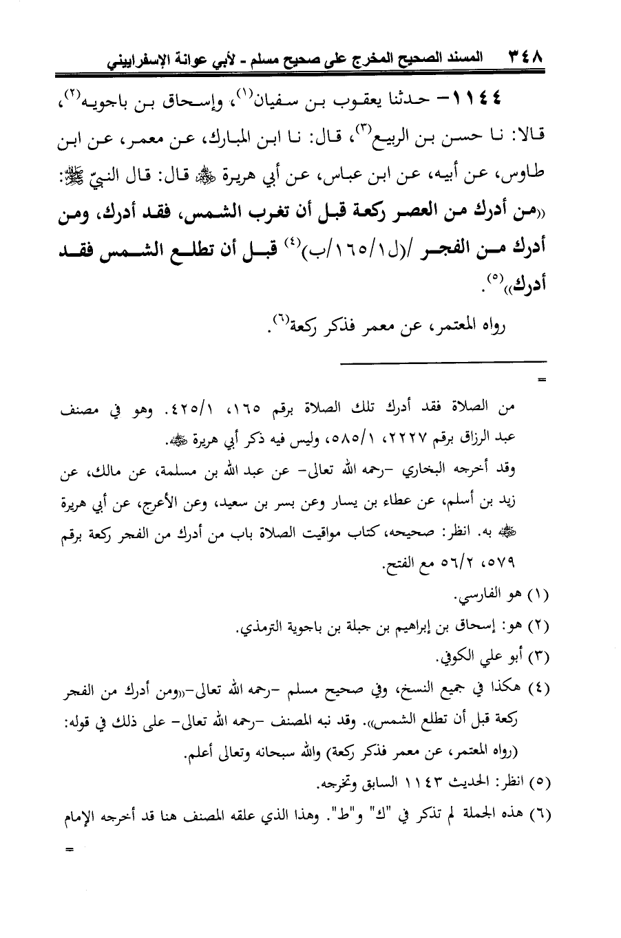 1144 - حدثنا يعقوب بن سفيان (¬1)، وإسحاق بن باجويه (¬2)، قالا: نا حسن بن الربيع (¬3)، قال: نا ابن المبارك، عن معمر، عن ابن طاوس، عن أبيه، عن ابن عباس، عن أبي هريرة -رضي الله عنه- قال: قال النبيّ صلى الله عليه وسلم: "من أدرك من العصر ركعة قبل أن تغرب الشمس، فقد أدرك، ومن أدرك من الفجر (¬4) قبل أن تطلع الشمس فقد أدرك" (¬5).