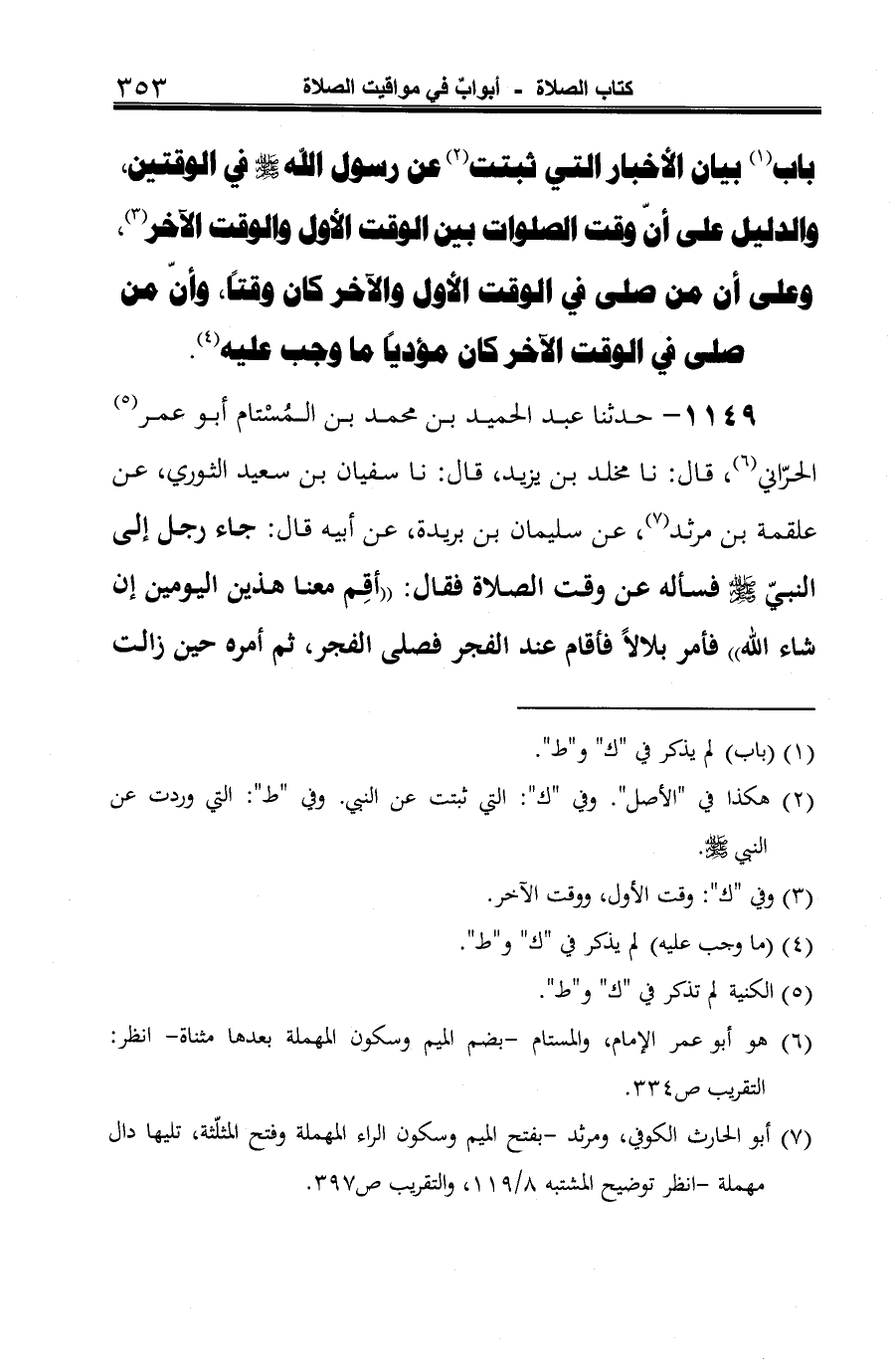 1149 - حدثنا عبد الحميد بن محمد بن المُسْتام أبو عمر (¬1) الحرّاني (¬2)، قال: نا مخلد بن يزيد، قال: نا سفيان بن سعيد الثوري، عن علقمة بن مرثد (¬3)، عن سليمان بن بريدة، عن أبيه قال: جاء رجل إلى النبيّ صلى الله عليه وسلم فسأله عن وقت الصلاة فقال: "أقِم معنا هذين اليومين إن شاء الله" فأمر بلالًا فأقام عند الفجر فصلى الفجر، ثم أمره حين زالت
