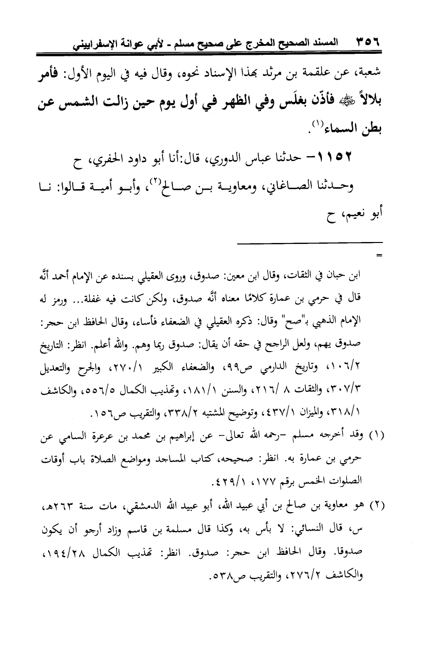 (¬1) هو معاوية بن صالح بن أبي عبيد الله، أبو عبيد الله الدمشقي، مات سنة 263 هـ، س، قال النسائي: لا بأس به، وكذا قال مسلمة بن قاسم وزاد أرجو أن يكون صدوقا. وقال الحافظ ابن حجر: صدوق. انظر: تهذيب الكمال 28/ 194، والكاشف 2/ 276، والتقريب ص 538.
