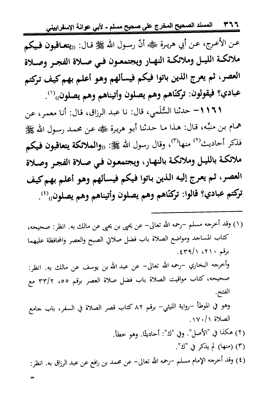 1161 - حدثنا السُّلَمي، قال: نا عبد الرزاق، قال: أنا معمر، عن همام بن منبِّه، قال: هذا ما حدثنا أبو هريرة رضي الله عنه عن محمد رسول الله صلى الله عليه وسلم فذكر أحاديث (¬1) منها (¬2)، وقال رسول الله صلى الله عليه وسلم: "والملائكة يتعاقبون فيكم ملائكة بالليل وملائكة بالنهار، ويجتمعون في صلاة الفجر وصلاة العصر، ثم يعرج إليه الذين باتوا فيكم فيسألهم وهو أعلم بهم كيف تركتم عبادي؟ قالوا: تركناهم وهم يصلون وأتيناهم وهم يصلون" (¬3).