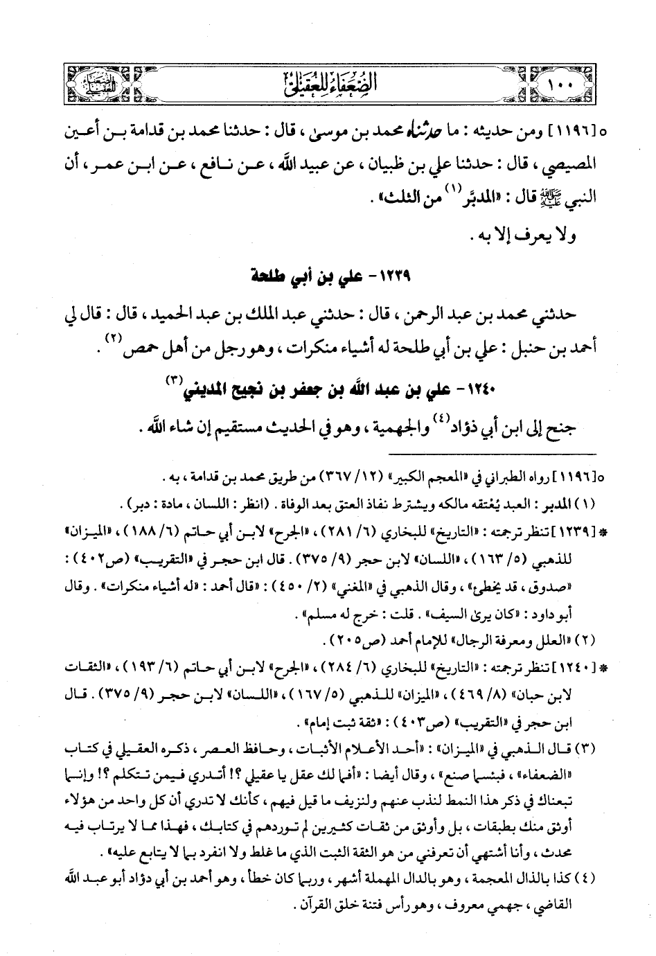 [1196] (3) ومن حديثه: ما حدثناه محمد بن موسى، قال: حدثنا محمد بن قدامة بن أعين المصيصي، قال: حدثنا علي بن ظبيان، عن عبيد الله، عن نافع، عن ابن عمر، أن النبي صلى الله عليه وسلمع قال: «المدبَّر (4) من الثلث».