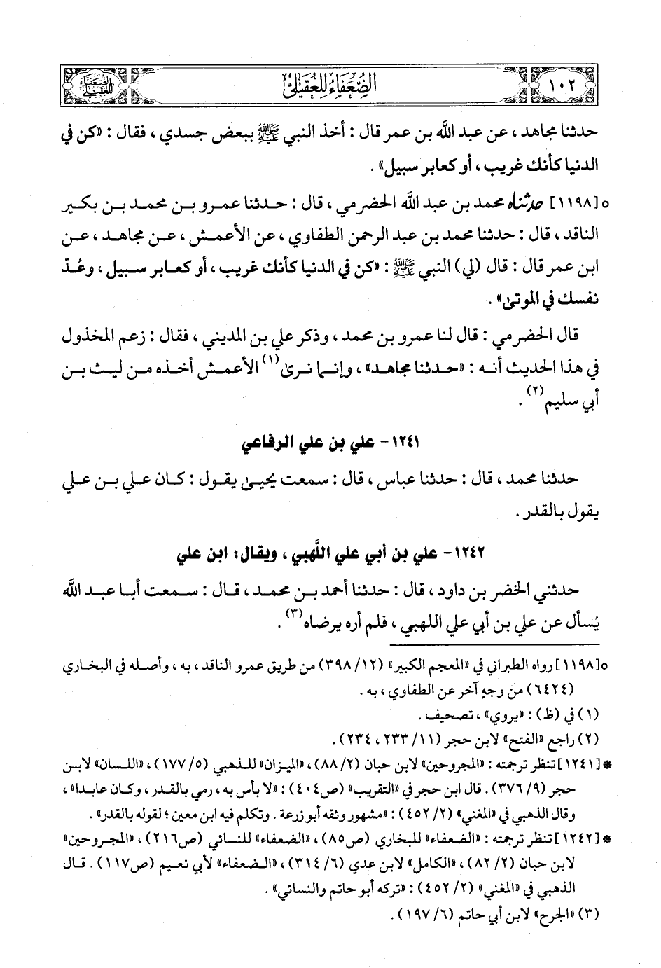[1197] (4) حدثنا العباس بن السندي ومحمد بن أيوب، قالا: حدثنا علي بن عبد الله بن جعفر المديني، قال: حدثنا محمد بن عبد الرحمن الطفاوي، عن الأعمش، قال: حدثنا مجاهد، عن عبد الله بن عمر قال: أخذ النبي صلى الله عليه وسلمع ببعض جسدي، فقال: «كن في الدنيا كأنك غريب، أو كعابر سبيل».