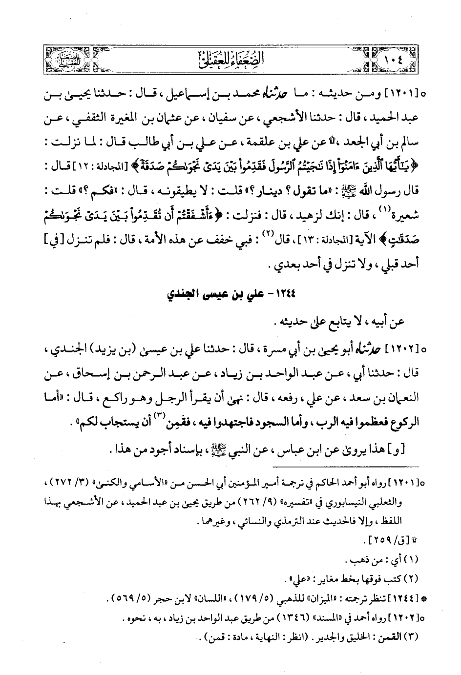 [1201] (5) ومن حديثه: ما حدثناه محمد بن إسماعيل، قال: حدثنا يحيى بن عبد الحميد، قال: حدثنا الأشجعي، عن سفيان، عن عثمان بن المغيرة الثقفي، عن سالم بن أبي الجعد (6)،? عن علي بن علقمة، عن علي بن أبي طالب قال: لما نزلت: {يَاأَيُّهَا الَّذِينَ آمَنُوا إِذَا نَاجَيْتُمُ الرَّسُولَ فَقَدِّمُوا بَيْنَ يَدَيْ نَجْوَاكُمْ صَدَقَةً} [المجادلة: 12] قال: قال رسول الله صلى الله عليه وسلمع: «ما تقول ؟ دينار ؟» قلت: لا يطيقونه، قال: «فكم ؟» قلت: