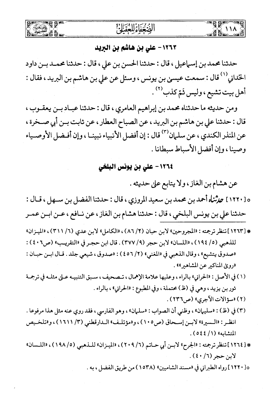 (4) * [1262] تنظر ترجمته: «الضعفاء» للبخاري (ص86) , «الضعفاء» للنسائي (ص217) , «المجروحين» لابن حبان (2/ 85) , «الكامل» لابن عدي (6/ 305) , «الضعفاء» لأبي نعيم (ص116). قال ابن حجر في «التقريب» (ص406): «ضعيف» , وقال الذهبي في «المغني» (2/ 457): «ضعفوه. وتركه الدارقطني».