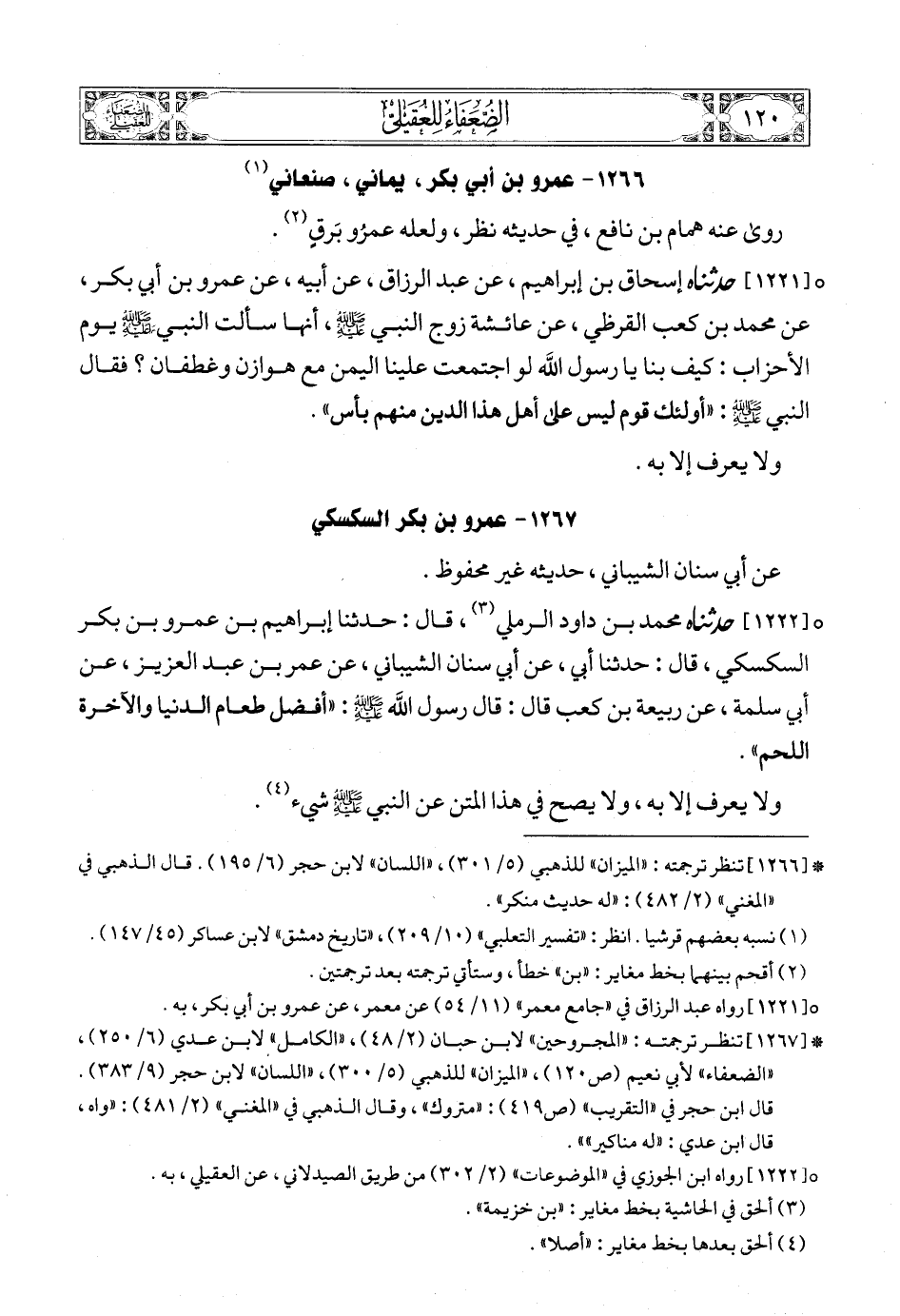 (2) * [1265] تنظر ترجمته: «الضعفاء» للنسائي (ص220) , «المجروحين» لابن حبان (2/ 47) , «الكامل» لابن عدي (6/ 232) , «الميزان» للذهبي (5/ 298) , «اللسان» لابن حجر (6/ 187). قال الذهبي في «المغني» (2/ 481): «كذاب، قال أحمد وغيره: «كان يضع الحديث»».