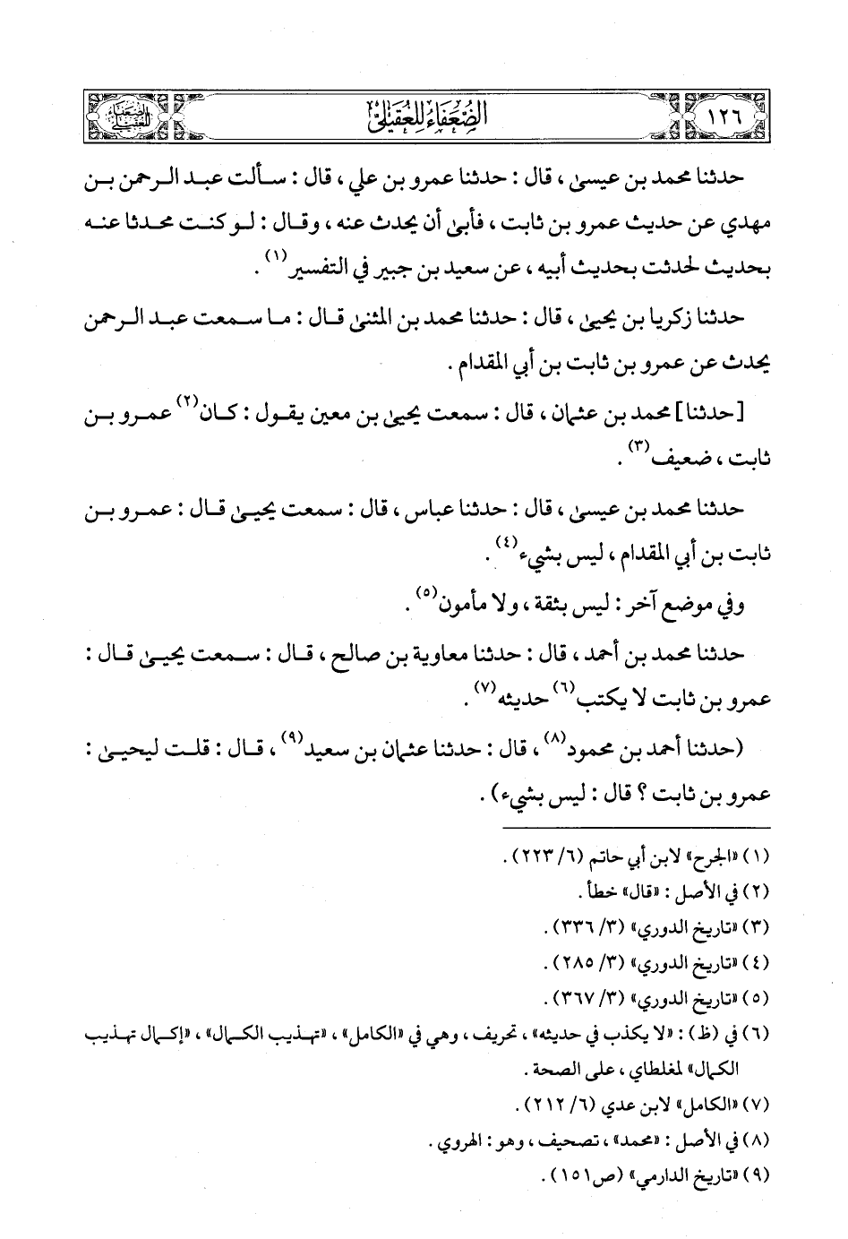(1) * [1271] تنظر ترجمته: «الضعفاء» للبخاري (ص87) , «الضعفاء» للنسائي (ص220) , «المجروحين» لابن حبان (2/ 42) , «الكامل» لابن عدي (6/ 212) , «الميزان» للذهبي (5/ 302). قال ابن حجر في «التقريب» (ص419): «ضعيف، رمي بالرفض» , وقال الذهبي في «المغني» (2/ 482): «متروك. وقال أبو داود: «رافضي»».