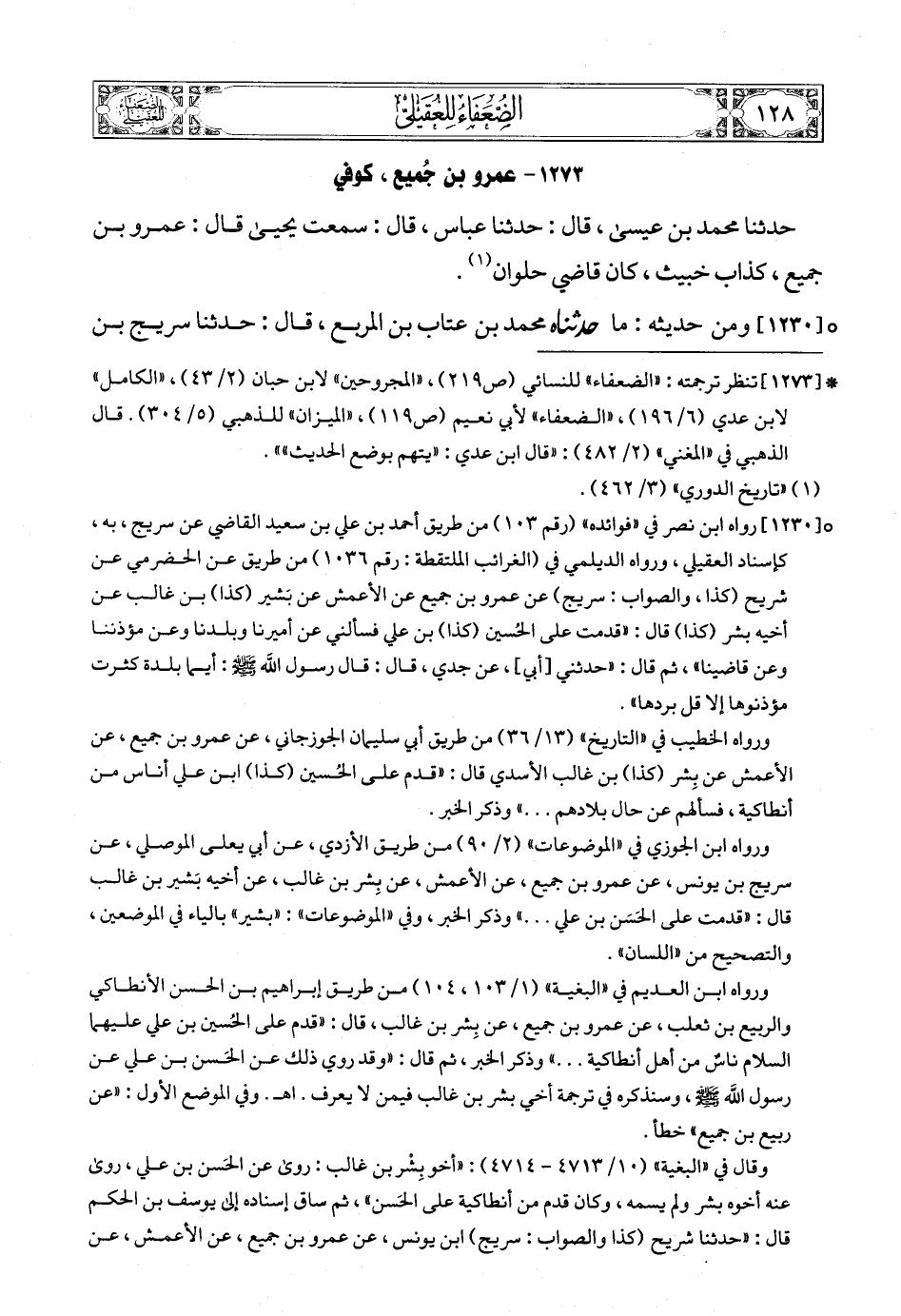 (5) * [1272] تنظر ترجمته: «الضعفاء» للنسائي (ص219) , «المجروحين» لابن حبان (2/ 34) , «الكامل» لابن عدي (6/ 199) , «الميزان» للذهبي (5/ 303). قال ابن حجر في «التقريب» (ص419): «ضعيف، شيعي» , وقال الذهبي في «المغني» (2/ 482): «هالك، وقال ابن لهيعة: «شيخ أحمق، كان يقول: إن عليا في السحاب»، وقال غيره: «كذاب»».