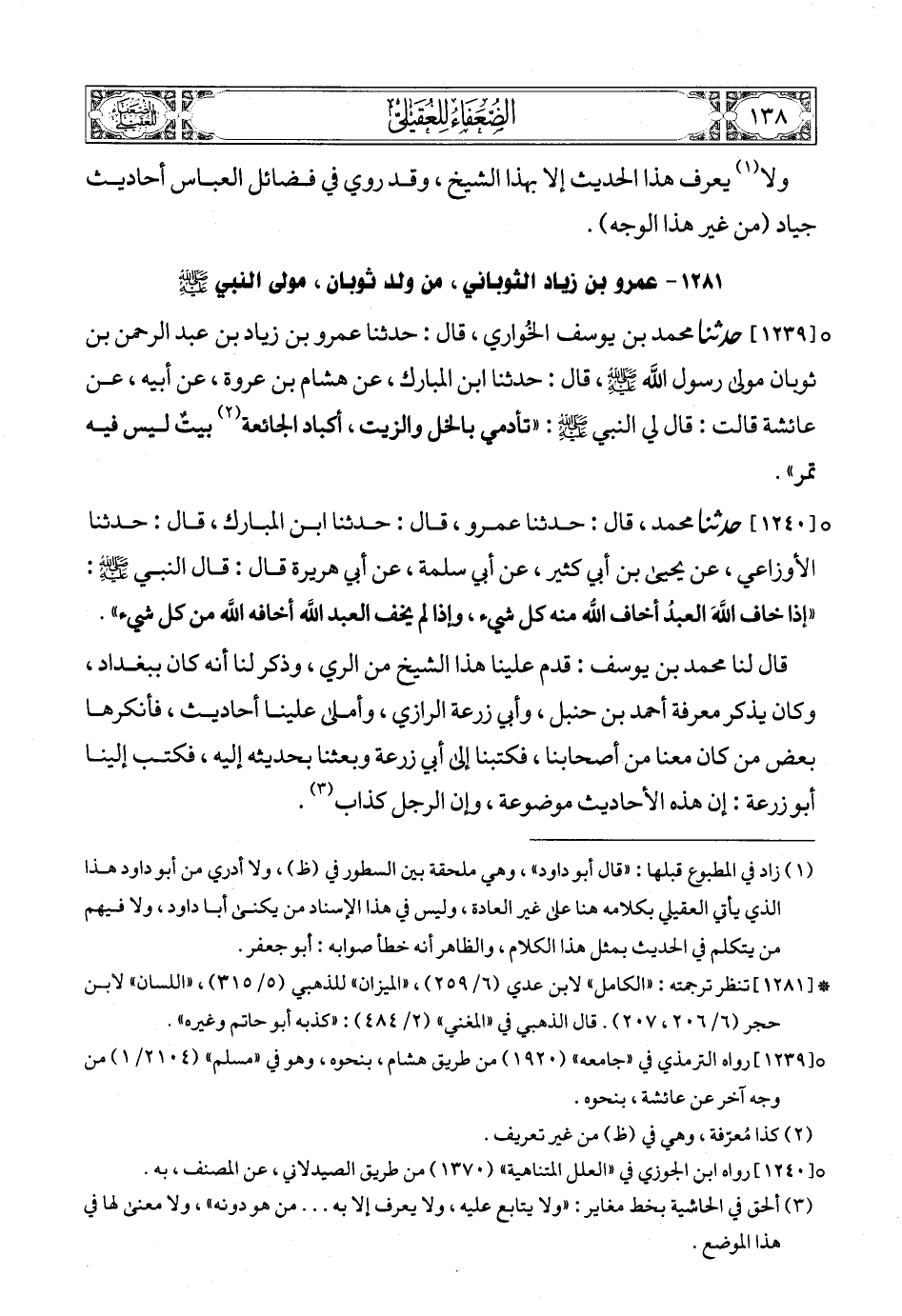 (1) * [1279] تنظر ترجمته: «المجروحين» لابن حبان (2/ 33) , «الكامل» لابن عدي (6/ 244) , «الميزان» للذهبي (5/ 354، 355). قال ابن حجر في «التقريب» (ص428): «مجهول» , وقال الذهبي في «المغني» (2/ 484): «قال البخاري: «لا يعرف»».