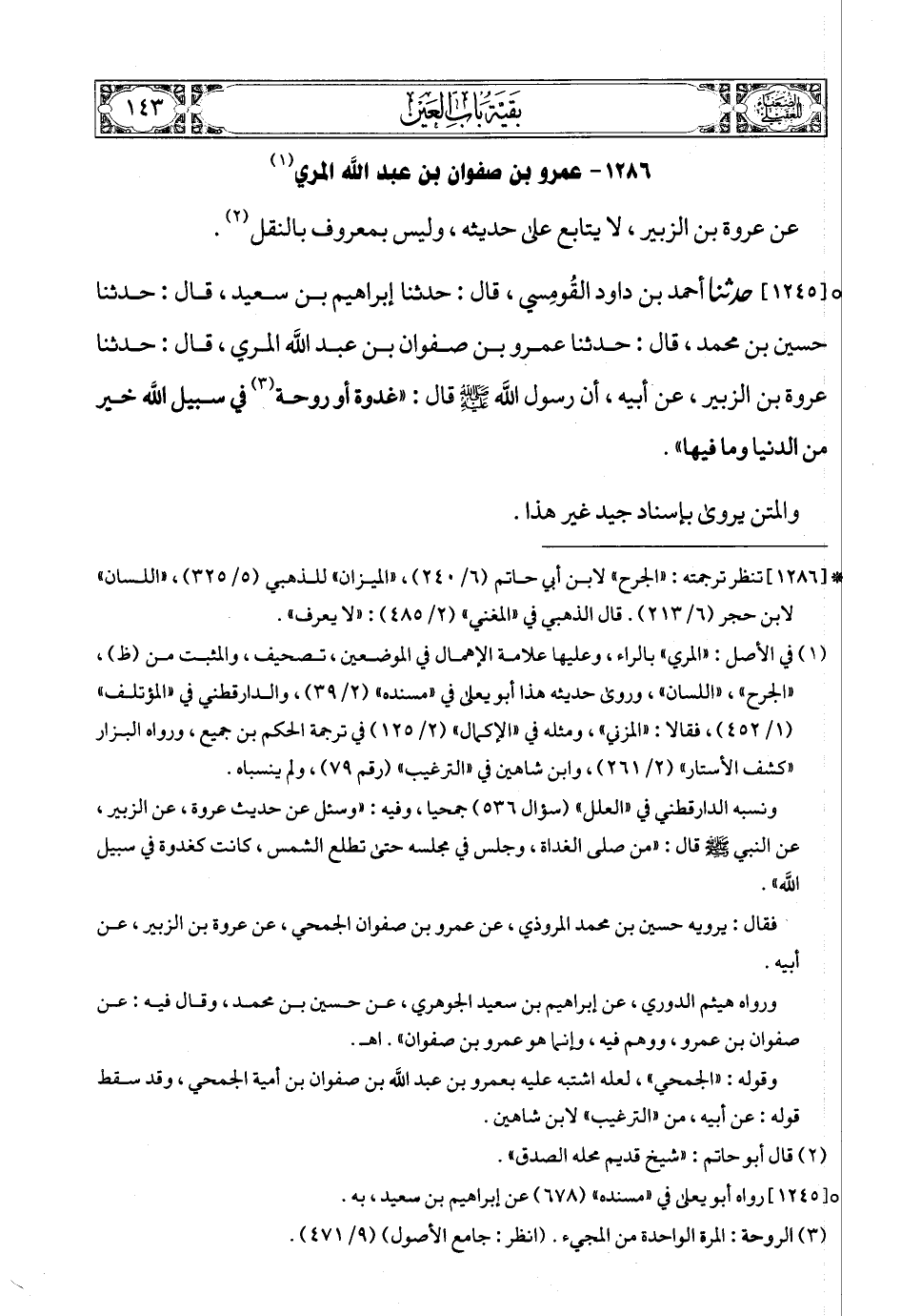(6) * [1285] تنظر ترجمته: «الضعفاء» للنسائي (ص220) , «المجروحين» لابن حبان (2/ 40) , «الكامل» لابن عدي (6/ 226) , «الضعفاء» لأبي نعيم (ص118) , «الميزان» للذهبي (5/ 324). قال الذهبي في «المغني» (2/ 485): «تركه الدارقطني وعدة. وكان شيعيا جبلا».