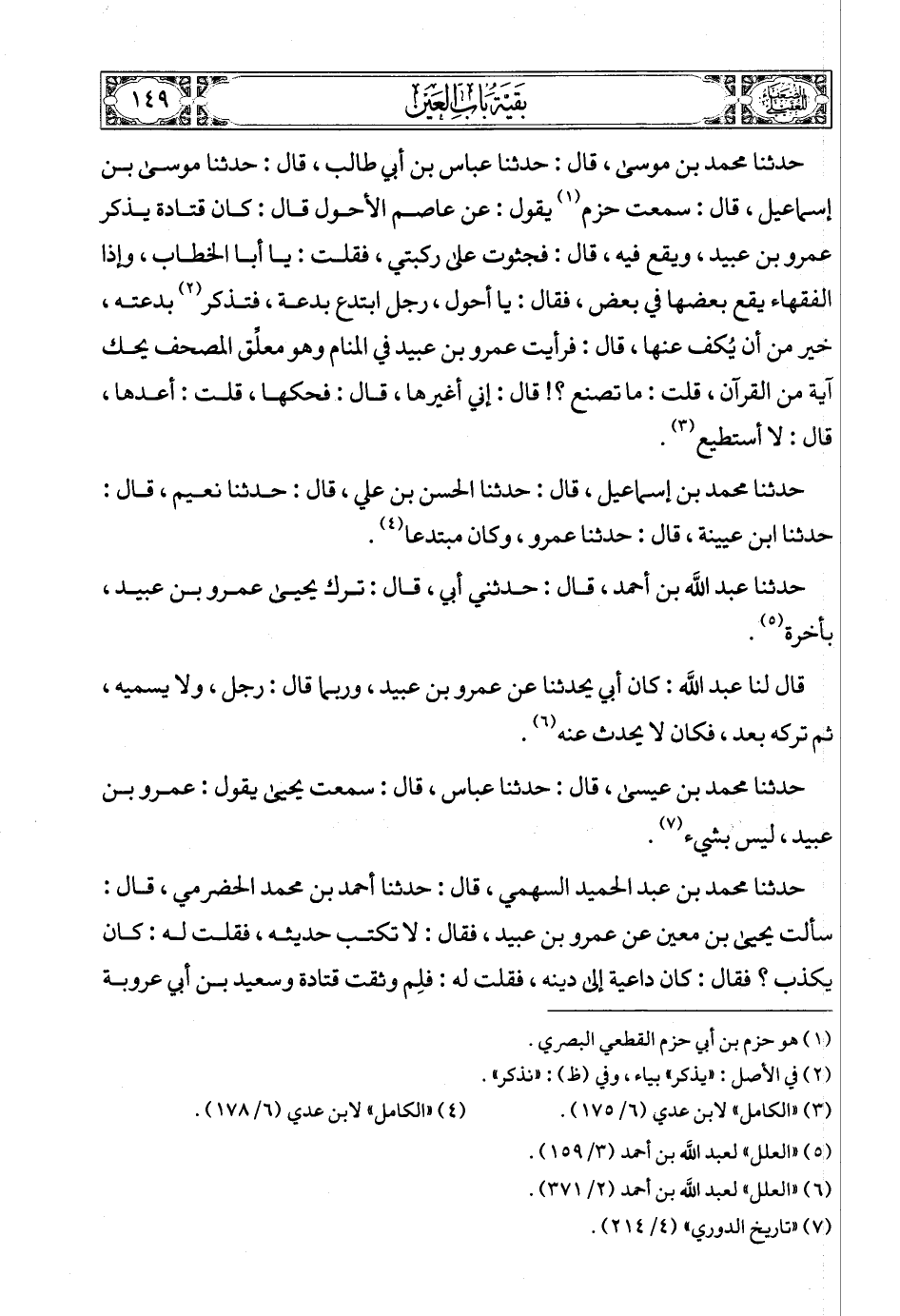 (6) رواه ابن عدي في «الكامل» (6/ 179)، ورواه الدارقطني في «أخبار عمرو بن عبيد»، من طريق عمرو الفلاس، ثم رواه من طريق آخر عن معاذ بن معاذ، قال: «كلمت عمرو بن عبيد في ميراث المبتوتة، فجعلت أحتج عليه بقول عثمان رضي الله عنه، أنه ورثها، فقال هو: لا ترث، فقلت: هذا عثمان حجتي، قال: إن عثمان لم يكن بحجة ولا سنة».