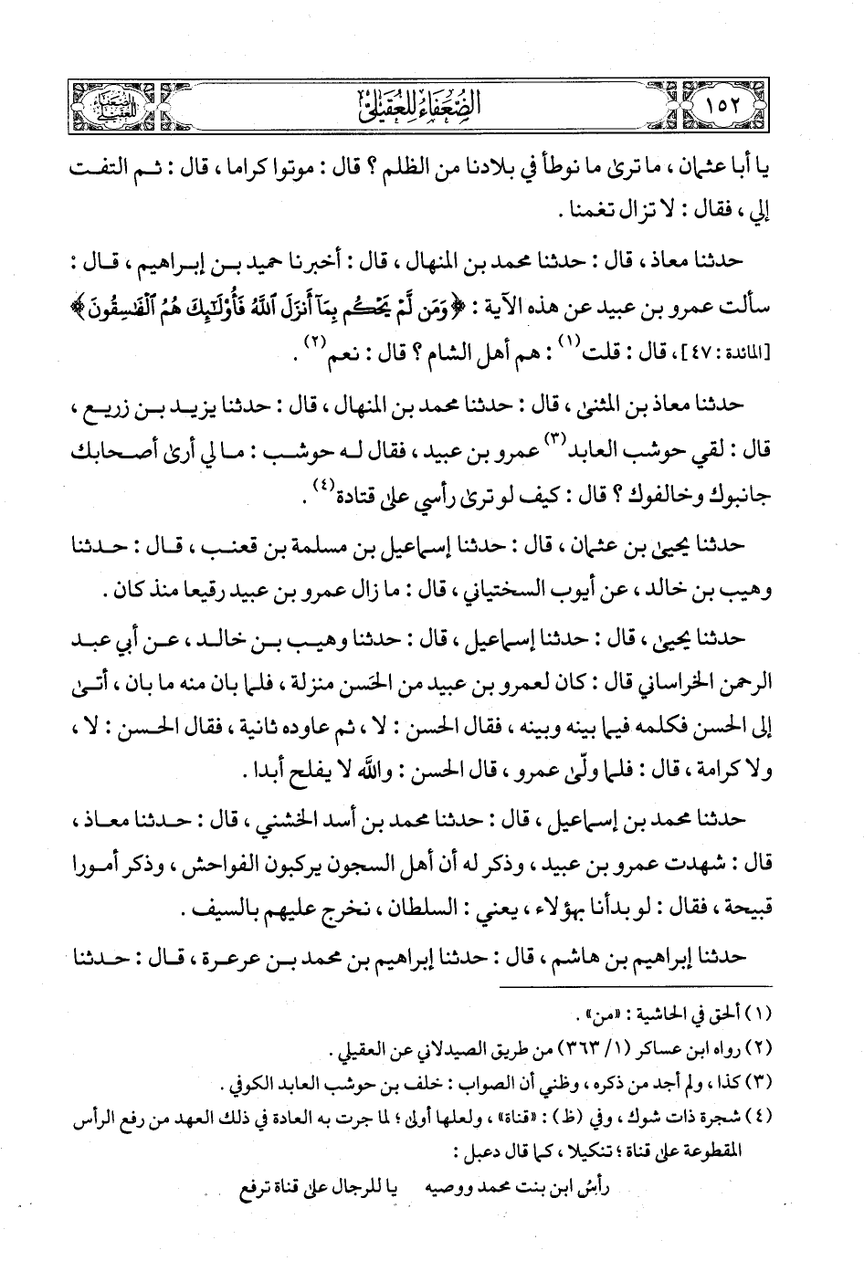 حدثنا خالد بن النضر القرشي، قال: حدثنا إسحاق بن إبراهيم بن حبيب بن الشهيد، قال: حدثنا قريش بن أنس، قال: سمعت عمرو بن عبيد يقول: يؤتى بي يوم القيامة، فأقام بين يدي الله، فيقول لي: أقلت: إن القاتل في النار ؟ فأقول: أنت قلته، ثم تلا هذه الآية: {وَمَن يَقْتُلْ مُؤْمِنًا مُّتَعَمِّدًا فَجَزَاؤُهُ جَهَنَّمُ ... } (3) [النساء: 93] حتى فرغ من الآية، فقلتُ، وما في البيت أصغر مني: أرأيتَ إن قال لك: أنا قلتُ: {إِنَّ اللَّهَ لَا يَغْفِرُ أَن يُشْرَكَ بِهِ وَيَغْفِرُ مَا دُونَ ذَلِكَ لِمَن يَشَاءُ} [النساء: 48]، من أين علمت أني لا أشاء أن أغفر لهذا ؟ فما رد علي بشيء (4).