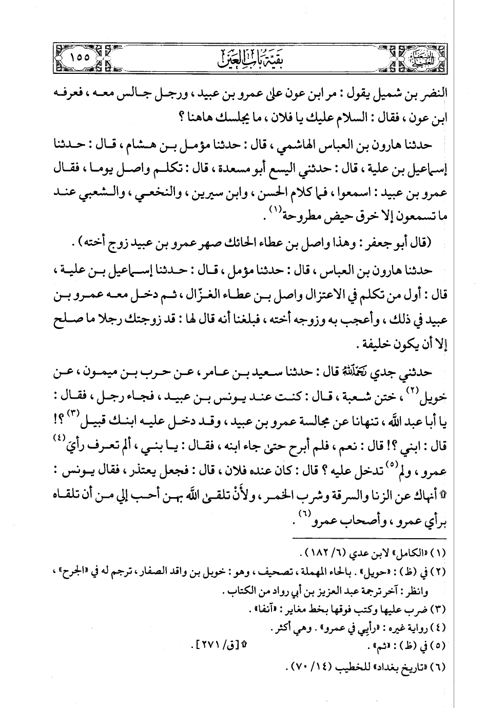 حدثنا عبد الله بن موسى البزاز (5)، قال: حدثنا إبراهيم بن محمد بن عرعرة، قال: حدثنا معاذ بن معاذ، قال: كنت عند عمرو بن عبيد، فجاء عثمان فرخاش أخو (6)