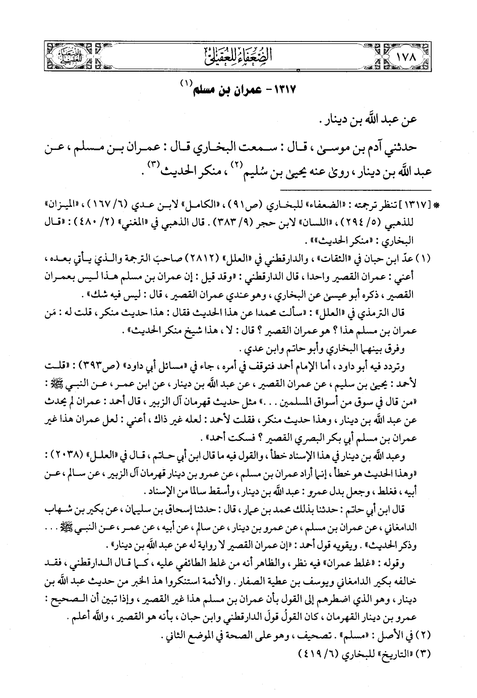 (7) في الأصل: «عن أبي عمران» تصحيف. راجع: ترجمة عمران من «الضعفاء» للبخاري، «الجرح»، «الكامل» لابن عدي، «الثقات» لابن حبان.