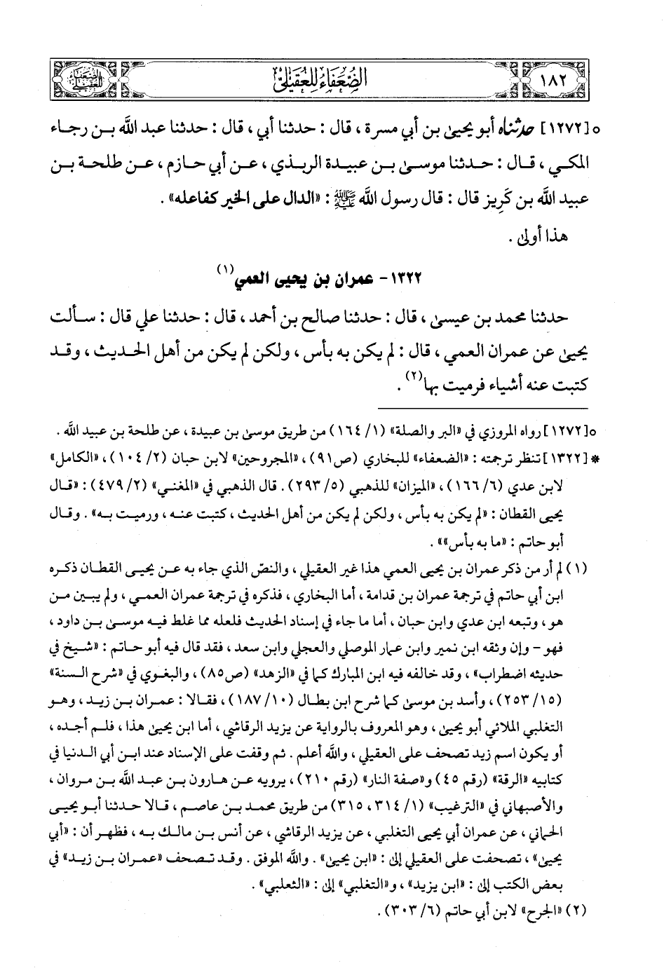 (1) * [1319] تنظر ترجمته: «المجروحين» لابن حبان (2/ 104) , «الكامل» لابن عدي (6/ 168) , «الميزان» للذهبي (5/ 295) , «اللسان» لابن حجر (9/ 383). قال ابن حجر في «التقريب» (ص430): «صدوق ربما وهم» , وقال الذهبي في «المغني» (2/ 480): «ثقة، لكنه قدري».
