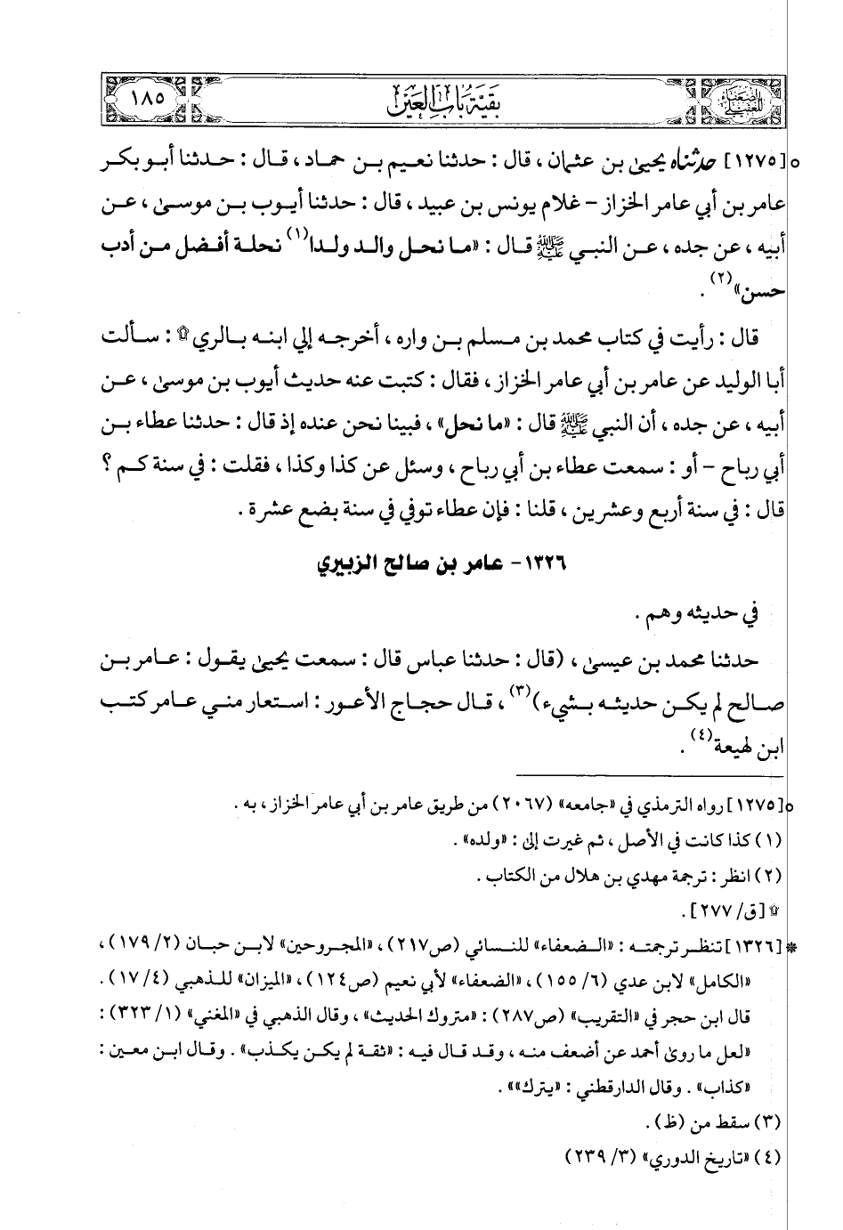 (4) * [1323] تنظر ترجمته: «الضعفاء» للبخاري (ص92) , «الكامل» لابن عدي (6/ 157) , «الميزان» للذهبي (4/ 21) , (5/ 207) , «اللسان» لابن حجر (4/ 381). قال الذهبي في «المغني» (1/ 324): «قال أبو حاتم: «ليس بالقوي»».