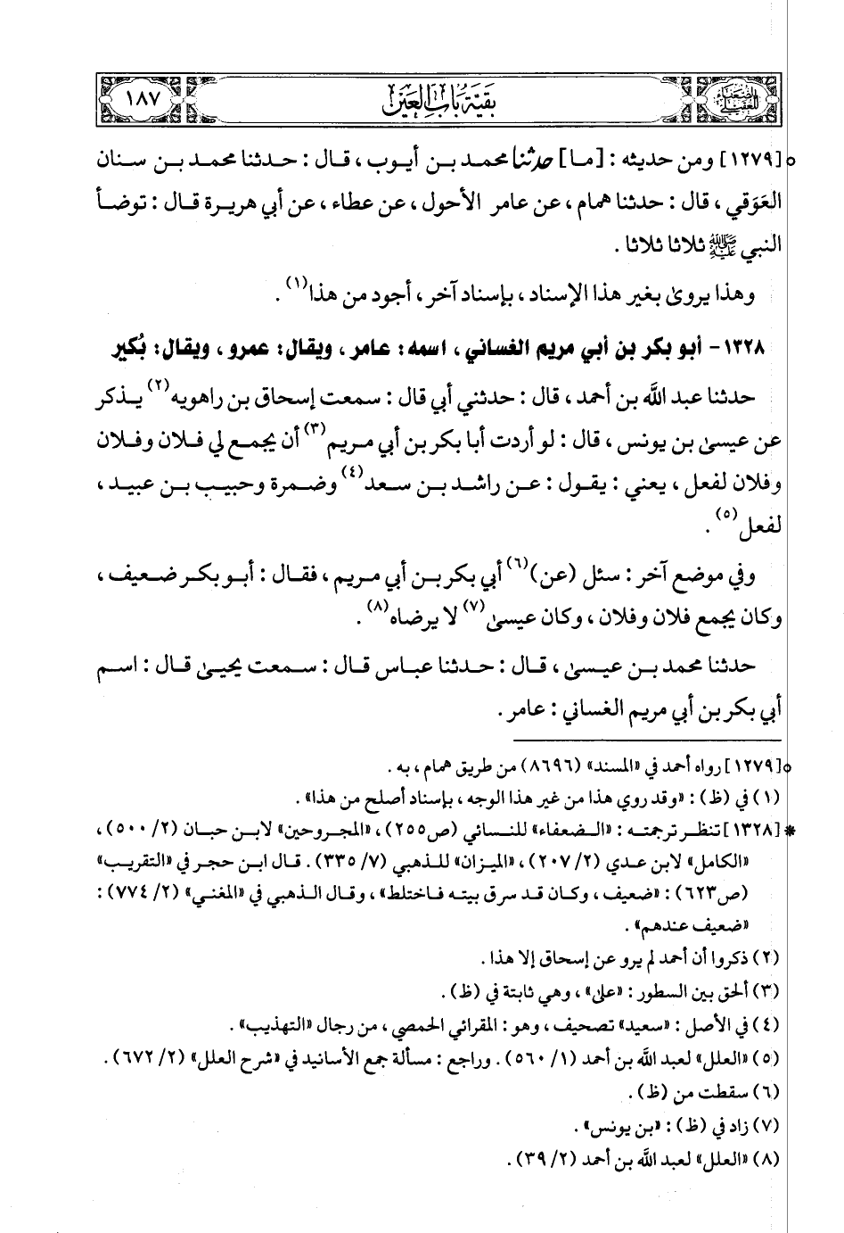 (5) * [1326] تنظر ترجمته: «الضعفاء» للنسائي (ص217) , «المجروحين» لابن حبان (2/ 179) , «الكامل» لابن عدي (6/ 155) , «الضعفاء» لأبي نعيم (ص124) , «الميزان» للذهبي (4/ 17). قال ابن حجر في «التقريب» (ص287): «متروك الحديث» , وقال الذهبي في «المغني» (1/ 323): «لعل ما روى أحمد عن أضعف منه، وقد قال فيه: «ثقة لم يكن يكذب». وقال ابن معين: «كذاب». وقال الدارقطني: «يترك»».