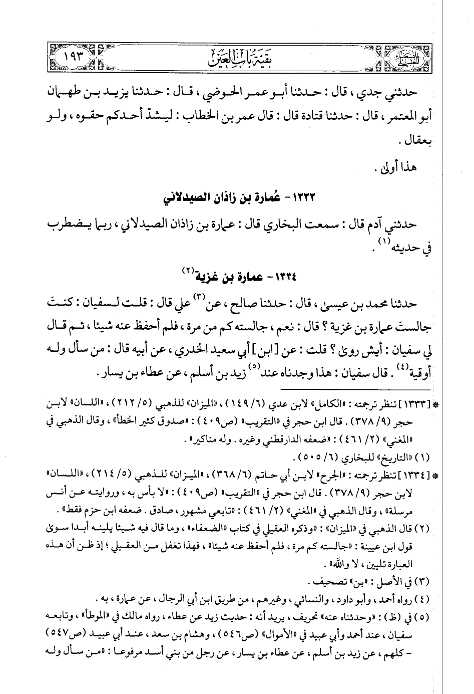حدثنا محمد بن عيسى، قال: حدثنا العباس، قال: سمعت يحيى، وقيل له: ما تقول في أبي هارون العبدي ؟ فقال: كانت عنده صحيفة، يقول: هذه صحيفة الوصي، وكان عندهم لا يصدق في حديثه (5).