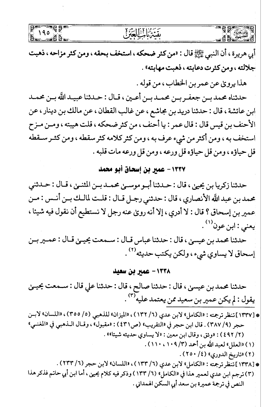 (4) قال الذهبي في «الميزان»: «وذكره العقيلي في كتاب «الضعفاء»، وما قال فيه شيئا يلينه أبدا سوى قول ابن عيينة: «جالسته كم مرة، فلم أحفظ عنه شيئا»، فهذا تغفل من العقيلي؛ إذ ظن أن هذه العبارة تليين، لا والله».