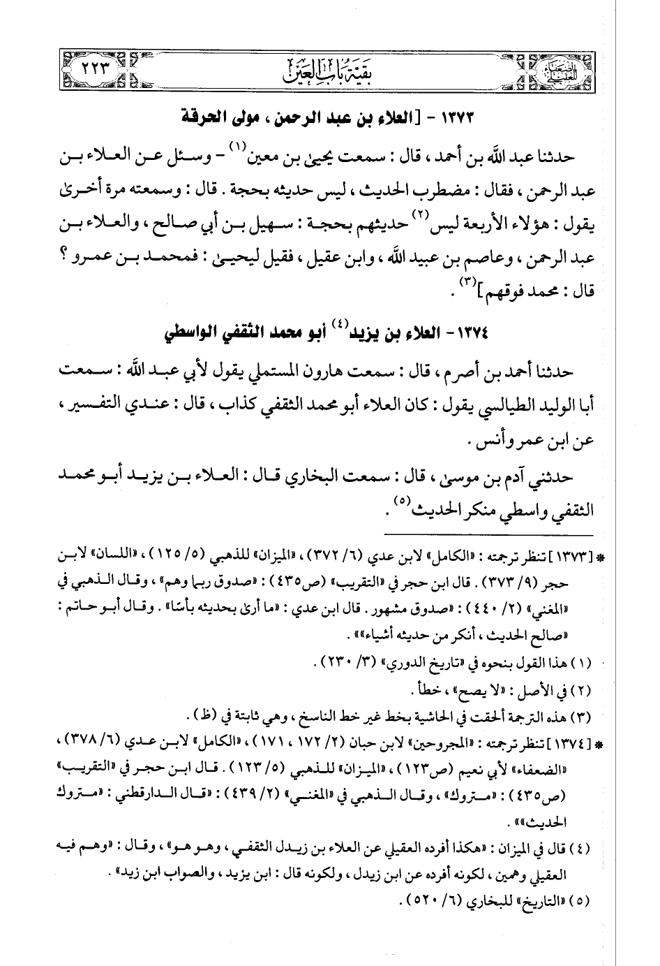 (3) * [1371] تنظر ترجمته: «سؤالات الآجري» (ص421)، «الثقات» لابن حبان (8/ 520)، «الميزان» للذهبي (5/ 87) , «اللسان» لابن حجر (5/ 439). قال الذهبي في «المغني» (2/ 433): «تكلم فيه لغلطه».