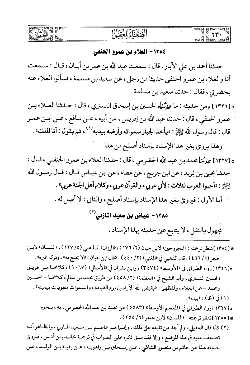 (5) * [1382] تنظر ترجمته: «الضعفاء» للنسائي (ص217) , «الكامل» لابن عدي (6/ 380) , «الميزان» للذهبي (5/ 130) , «اللسان» لابن حجر (5/ 468). قال الذهبي في «المغني» (2/ 440): «ضعفه ابن معين والنسائي».