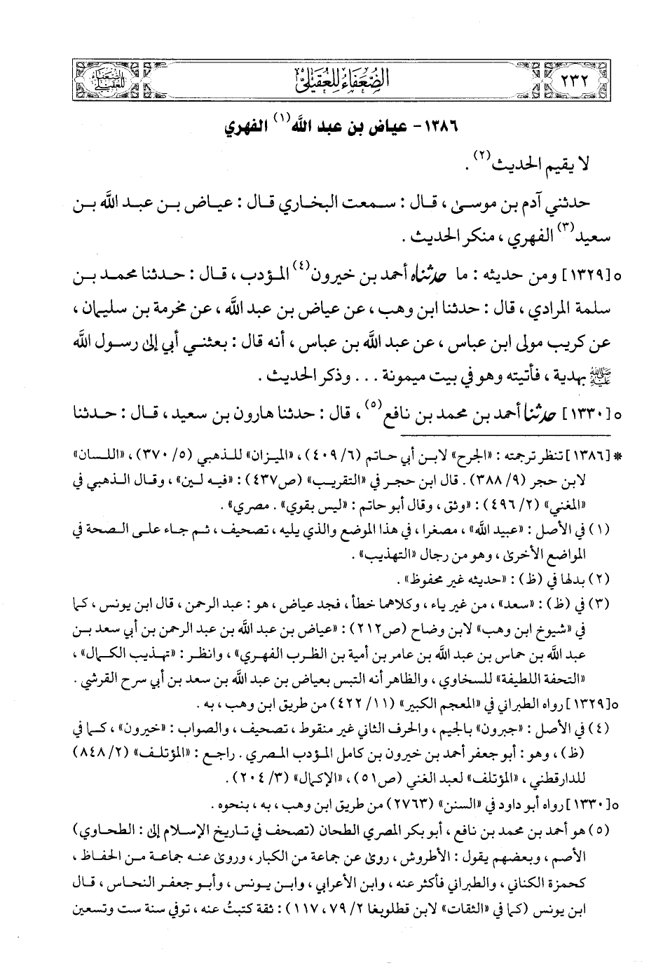 (1) * [1384] تنظر ترجمته: «المجروحين» لابن حبان (2/ 176) , «الميزان» للذهبي (5/ 127) , «اللسان» لابن حجر (5/ 466). قال الذهبي في «المغني» (2/ 440): «قال ابن حبان: «لا يحتج به»، وتركه غيره».
